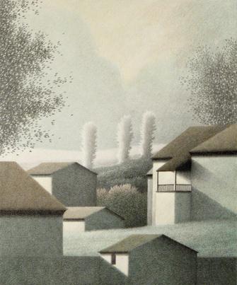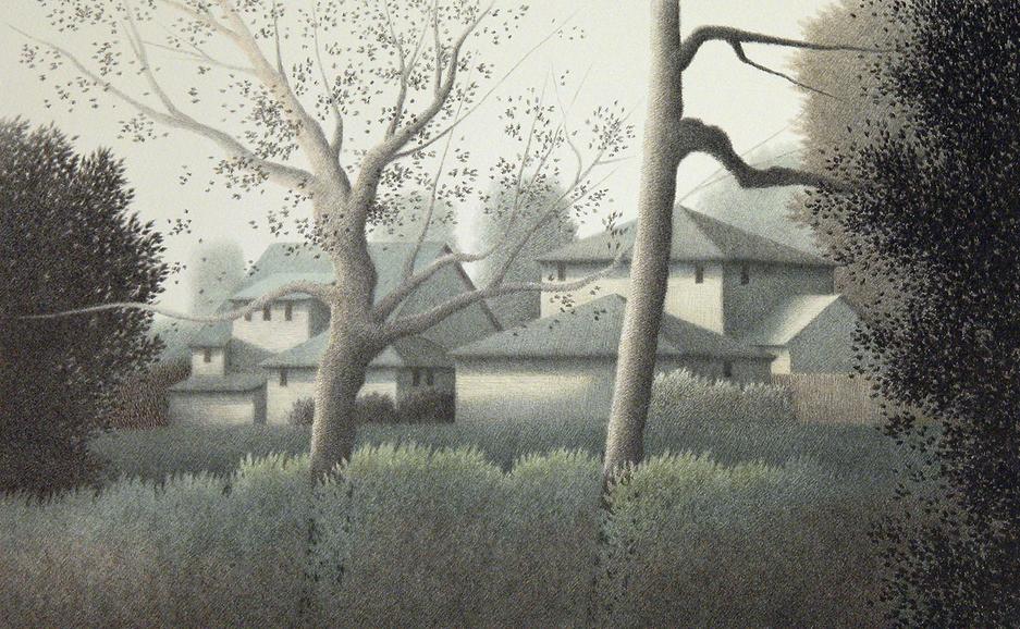 The remarkable subtlety of his color lithographs is perhaps best demonstrated in this exhibition by the 1987 print Green, green Merely a handful of verdant shades gives us the depth of the valley, the possibility of an approaching storm, and the lingering shadows of the passing day. And, where the array of green tones in some ways diminish a sense of contrast, he once again balances strength with softness, enveloping the geometric man-made shapes of houses and roofs amidst the contrasting rounded and flowing qualities of the natural landscape As is often the