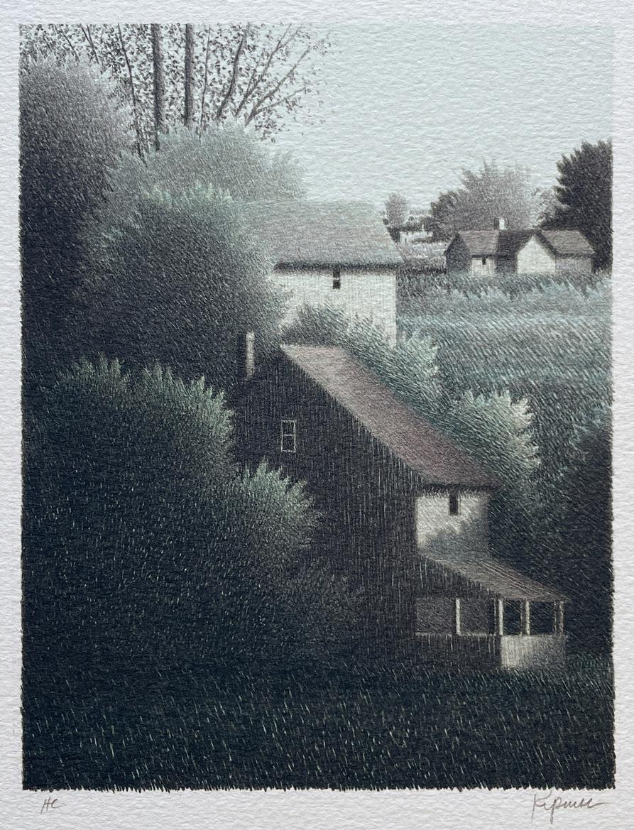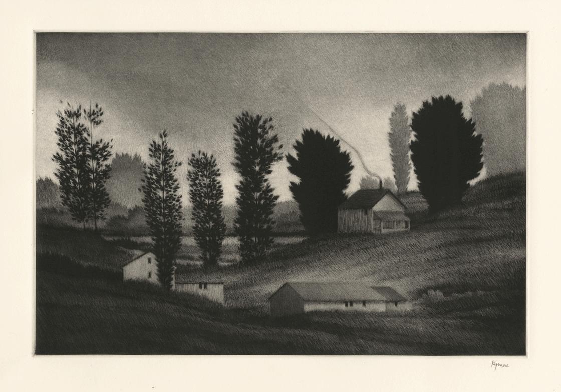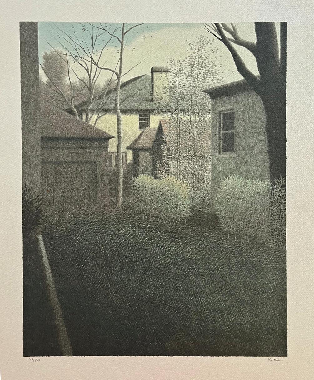 In addition to his black and white mezzotints, Kipniss’s color lithographs are infused with muted warmth, softness and light. His tones are sparing, harmonious and homogenous, once again forming imagery that feels more like a memory than a precise depiction of the world around us. In the catalogue raisonné of graphic work by Karl Lunde, Lunde states, “The poetic landscapes of Robert Kipniss are dreams which lead us to discover the special unity of man and nature, a realization so poignant they arouse a sense in most viewers that they know that particular place, that once they were there” These evocations of a simple place and time – a courtyard bathed in sunlight, a rising moon beyond a hillside, a shadow cast across the side of a house are enhanced by his use of color, giving them the faded glow of moments so fleeting, they live in the delicate space where reality and reverie meet.