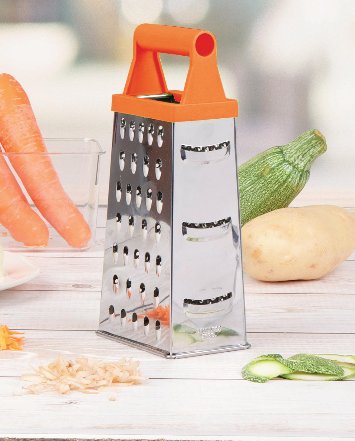 ·Los laterales cuentan con 3 distintos cortes, grosores y filos para rallar o rebanar los alimentos.