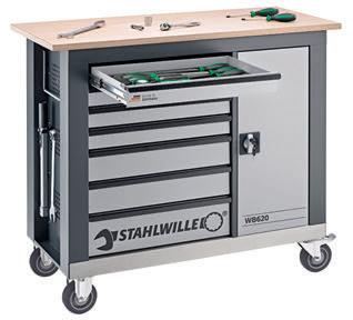 STAHLWILLE’s Mobile Workbench WB620 – state-of-the-art, sturdy and versatile, based on the highly successful Tool Trolley 95VA. The working height of 103 cm is ideal for professional work, the worktop is generously dimensioned and the unit is equipped with seven fully extendible drawers. The three-stage safety concept protects against unauthorised removal of tools and prevents toppling since only one drawer can be opened at any time.