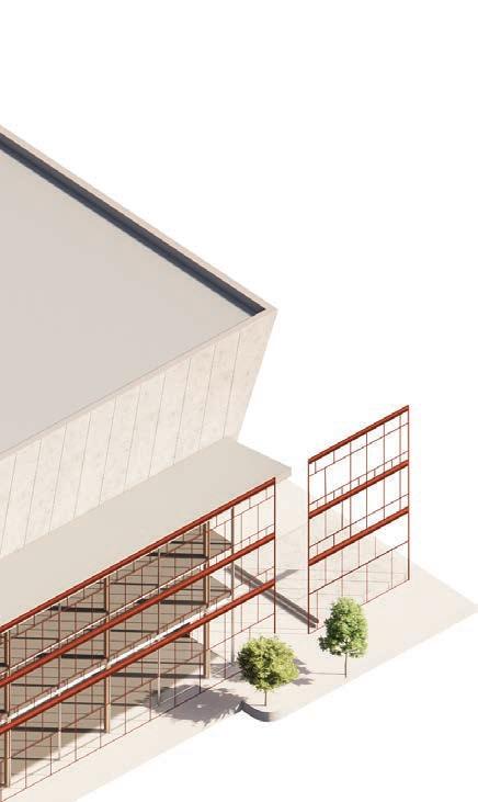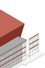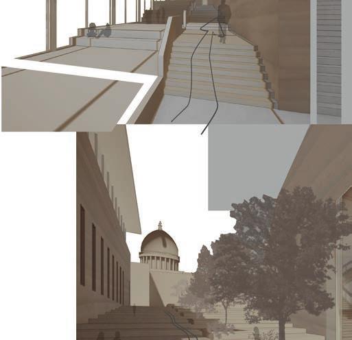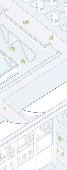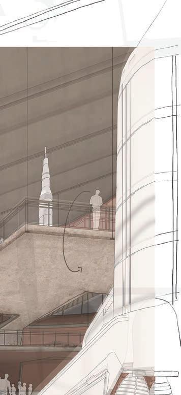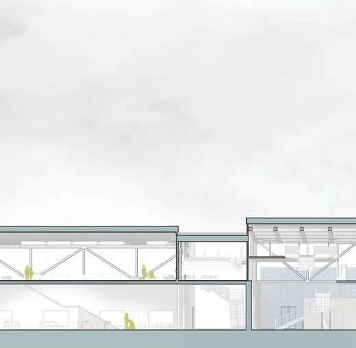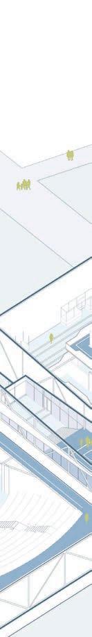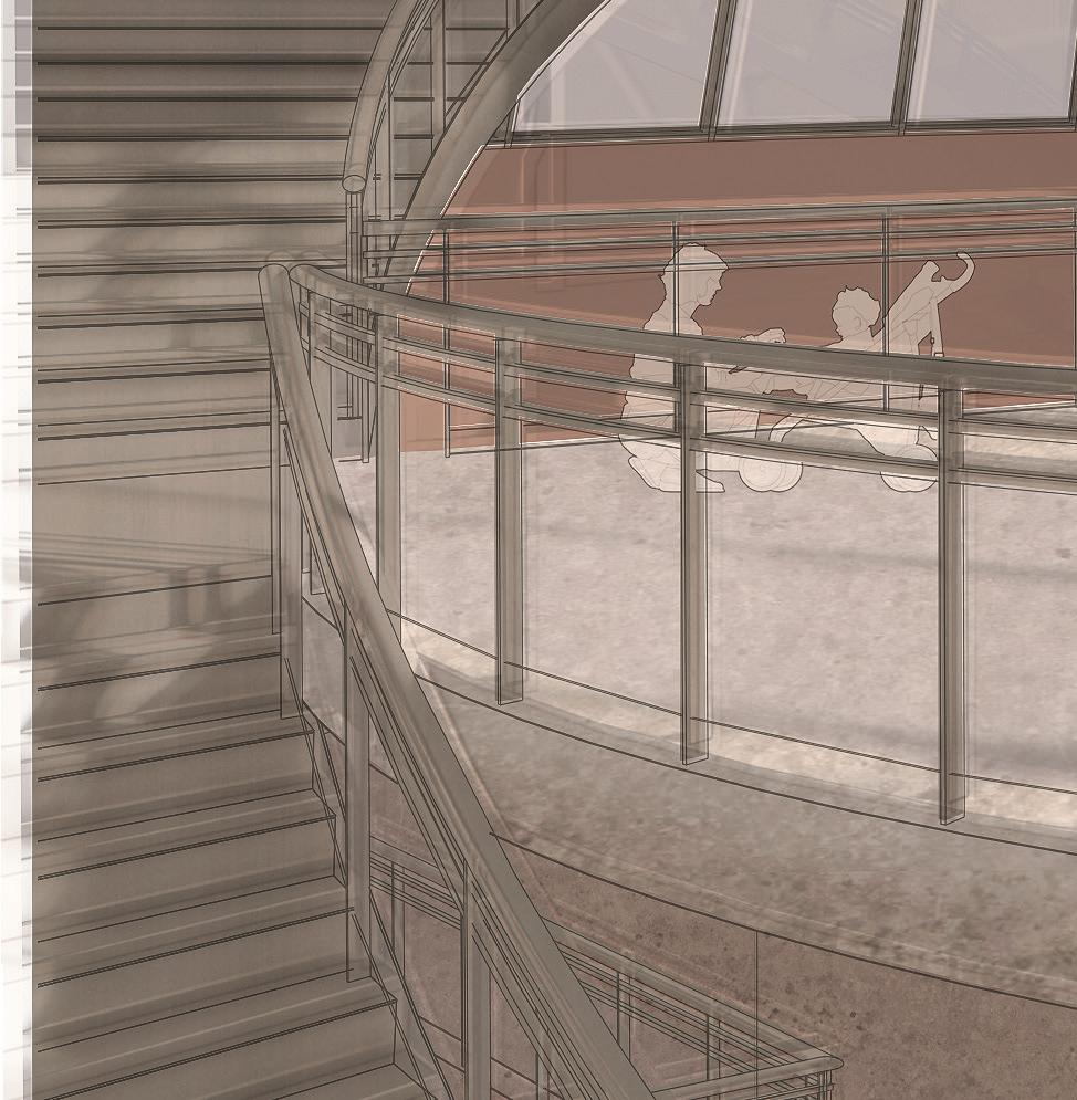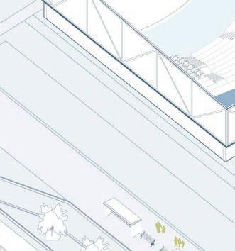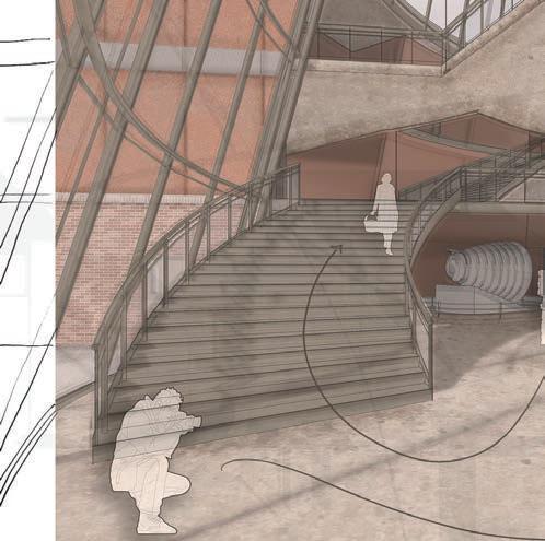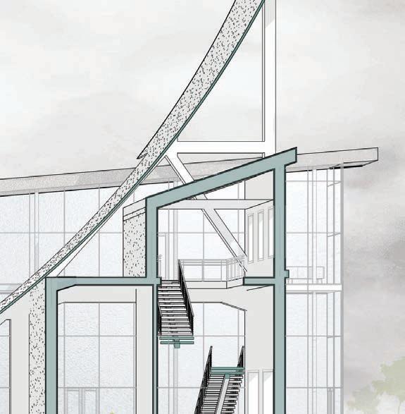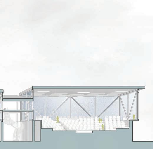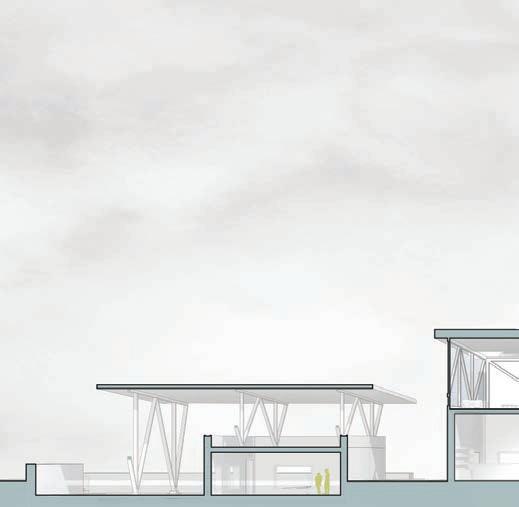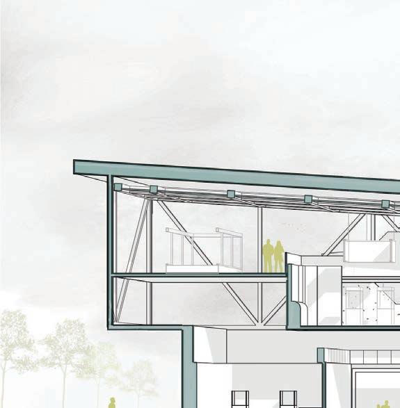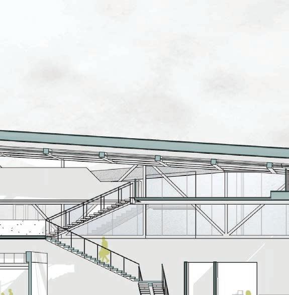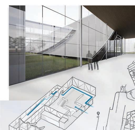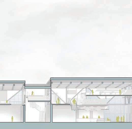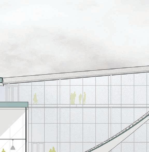terraced seating and circulation stair. The procession guides visitors from the heavy base modules to the lifted clerestories. The recreational building also occupies this clerestory at its lookout point, connecting the public Waterloo Park to the reclaimed museum site.