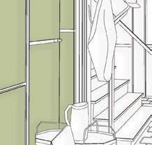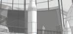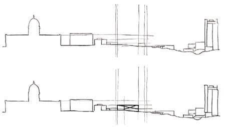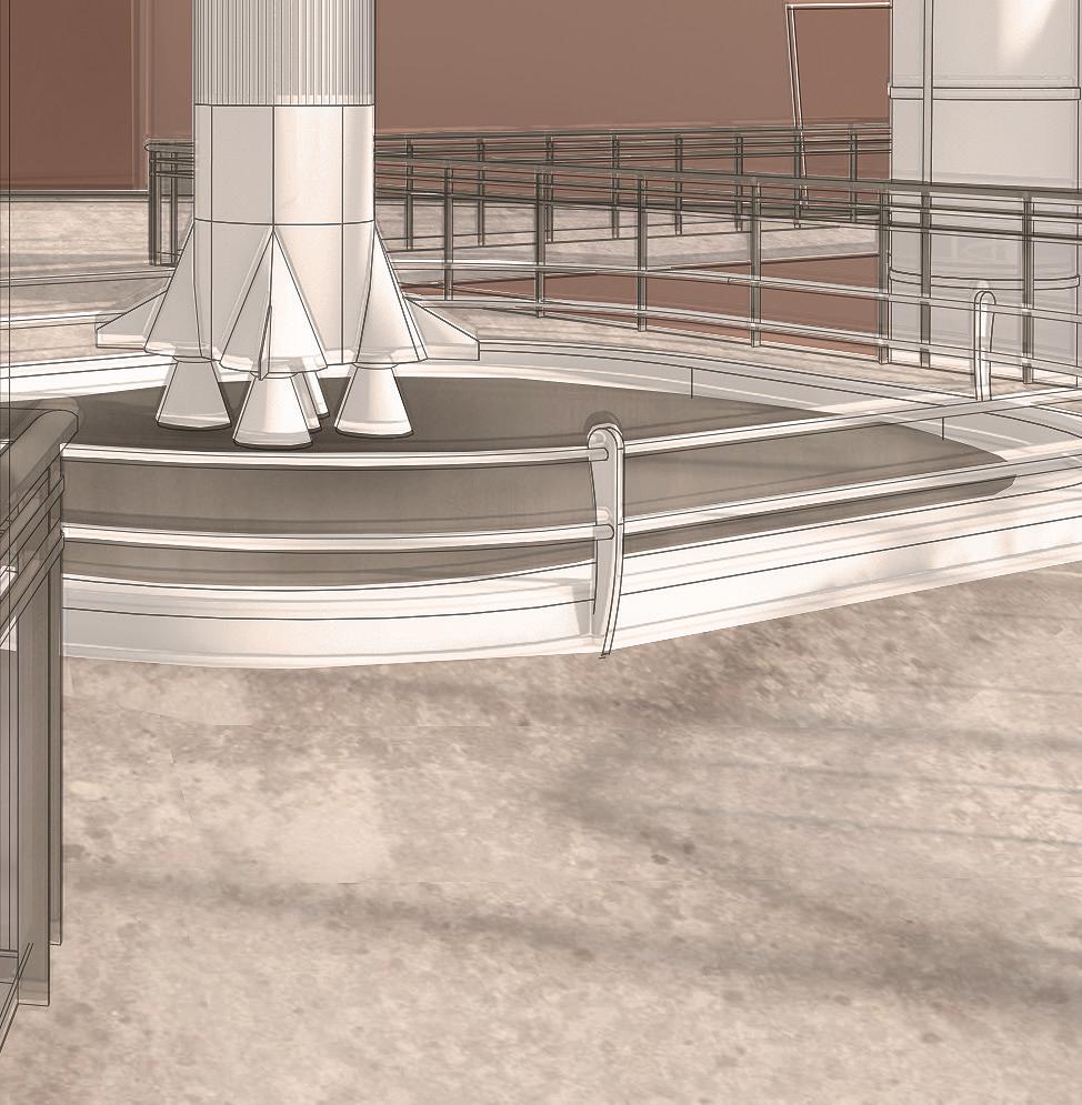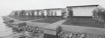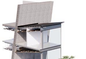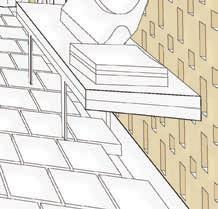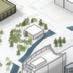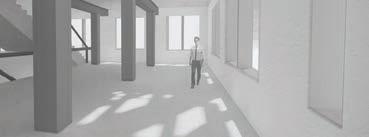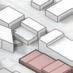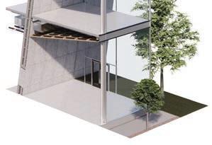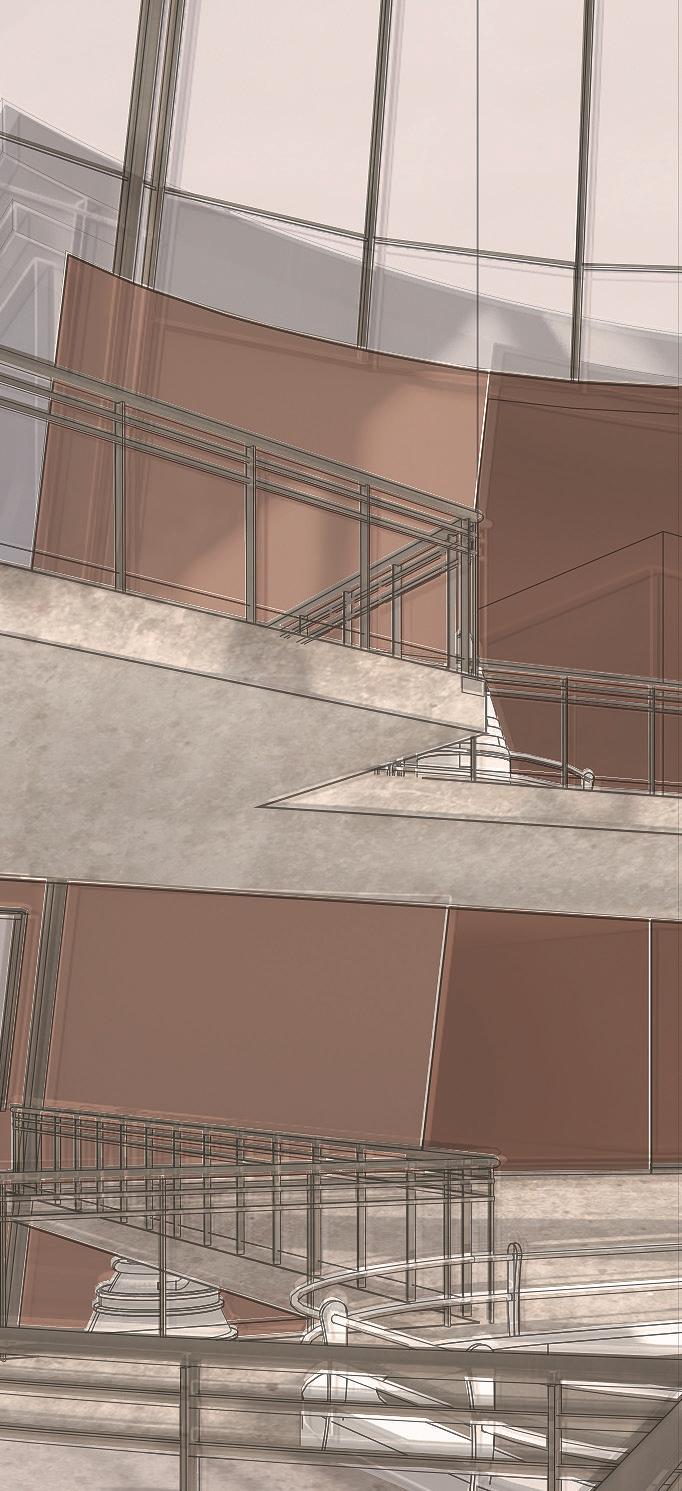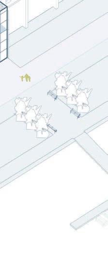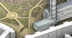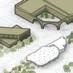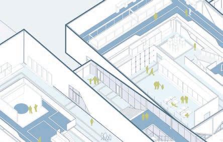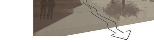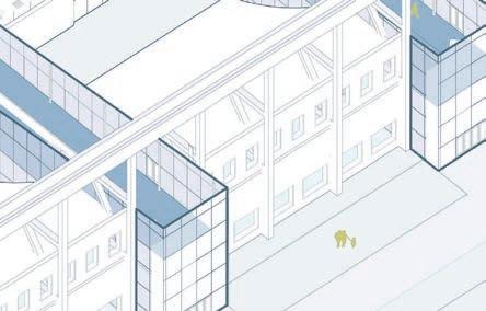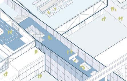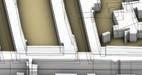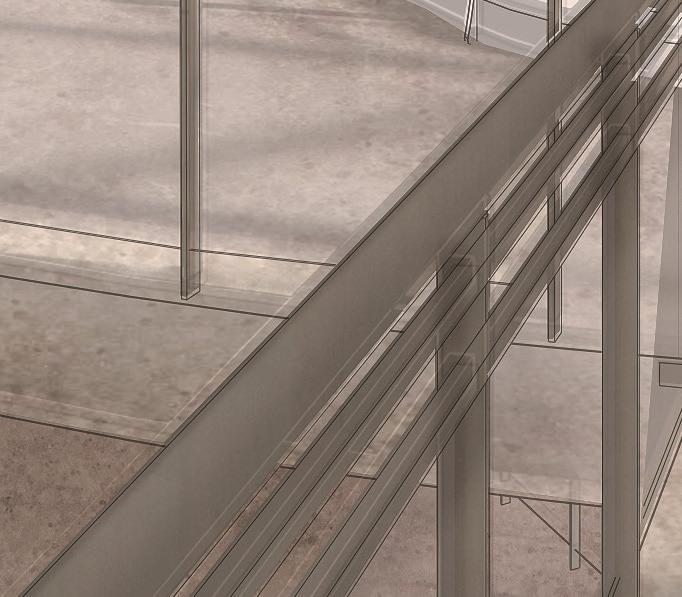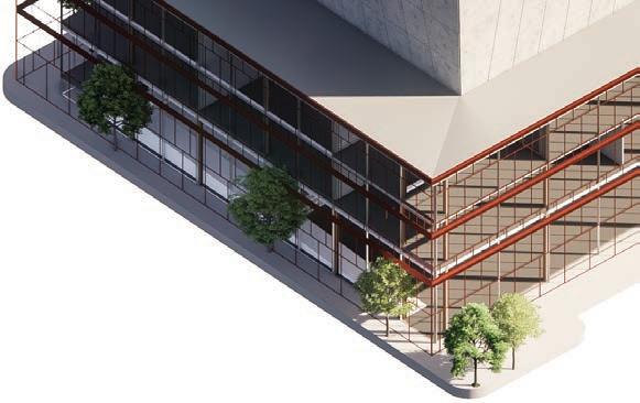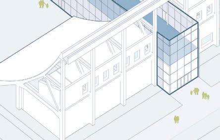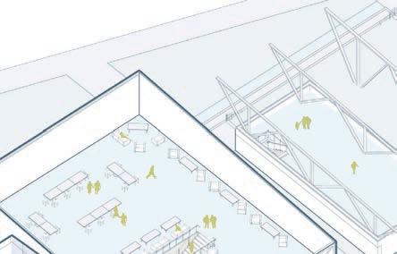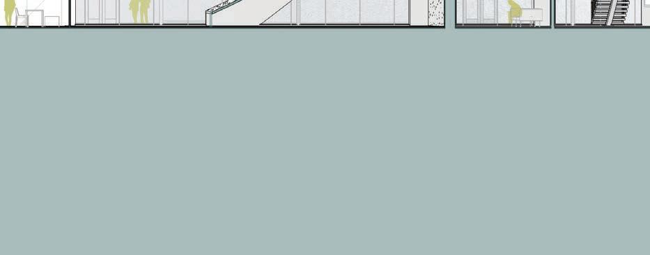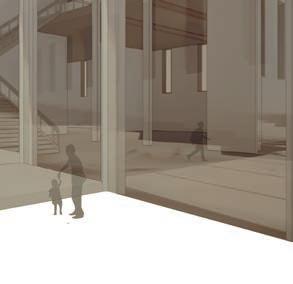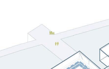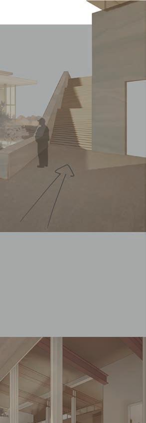 terraced seating and circulation stair. The procession guides visitors from the heavy base modules to the lifted clerestories. The recreational building also occupies this clerestory at its lookout point, connecting the public Waterloo Park to the reclaimed museum site.