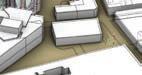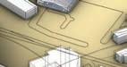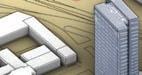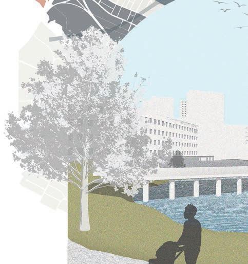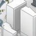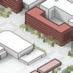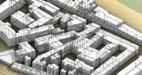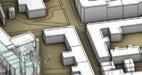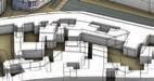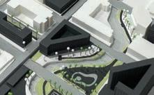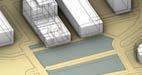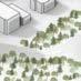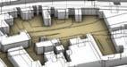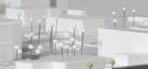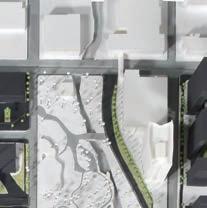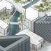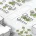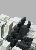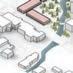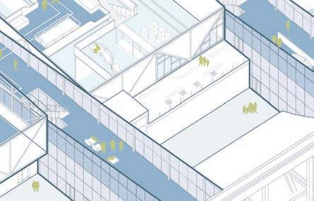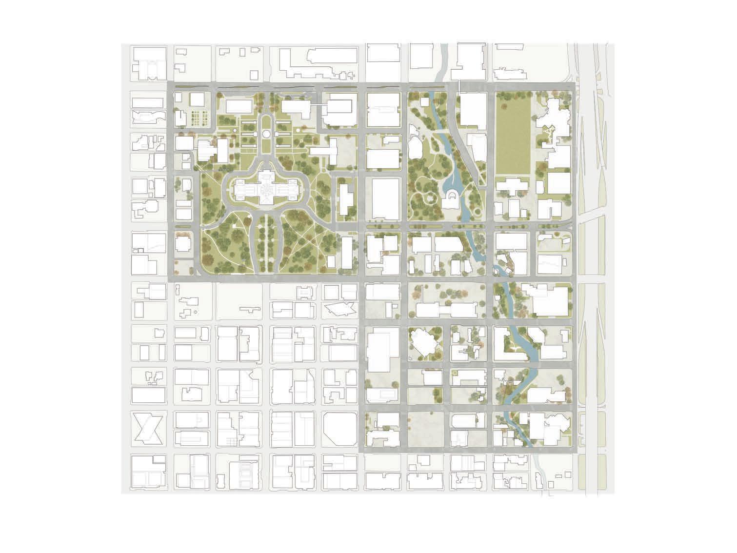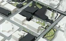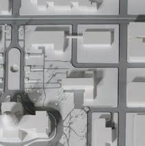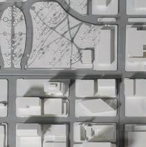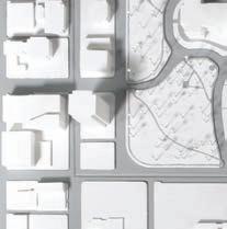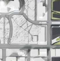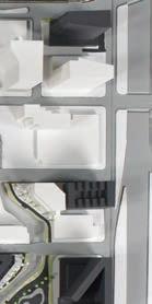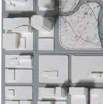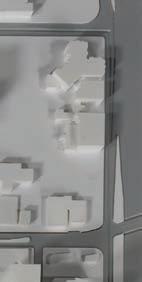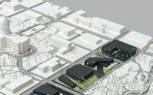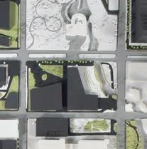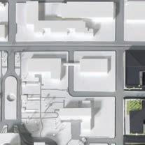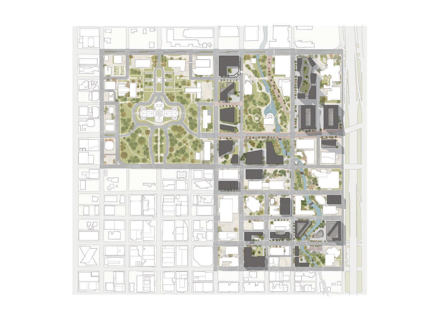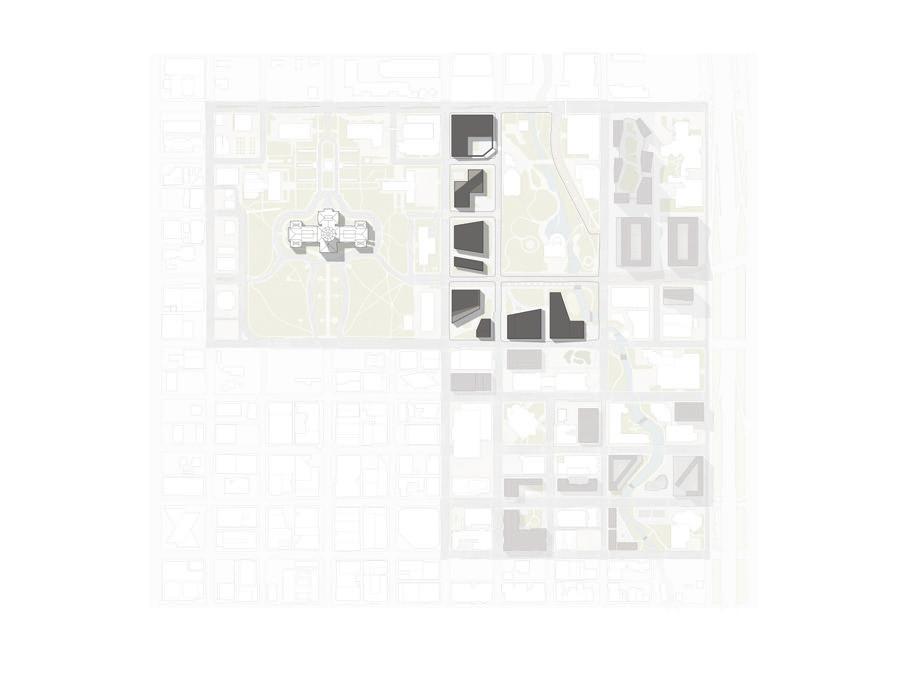 The masterplan enhances existing districts by incorporating dense typologies, pedestrian walkways, and public program.