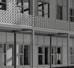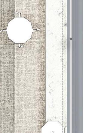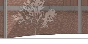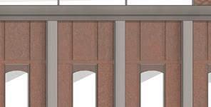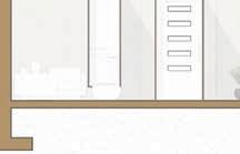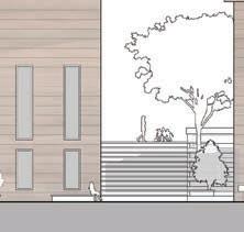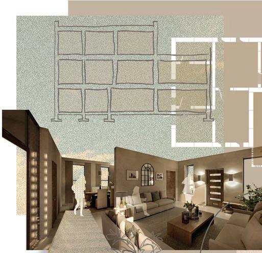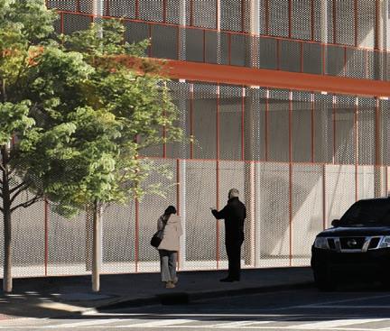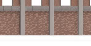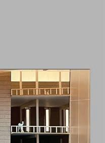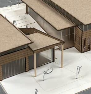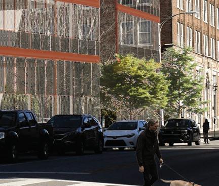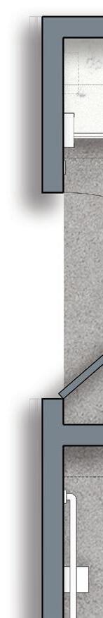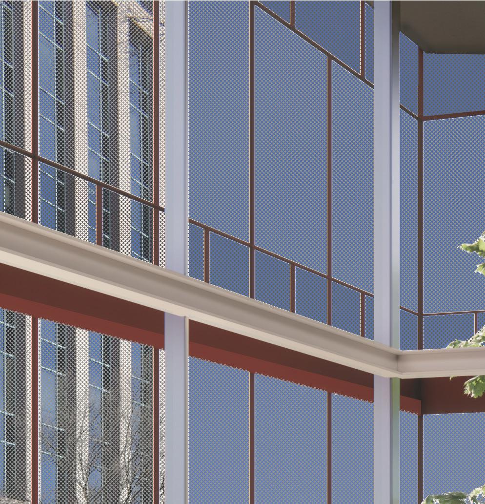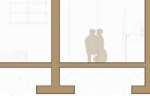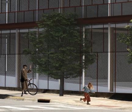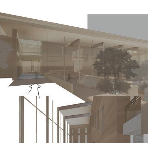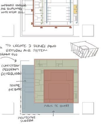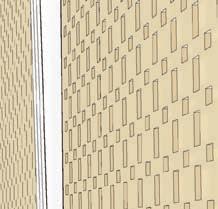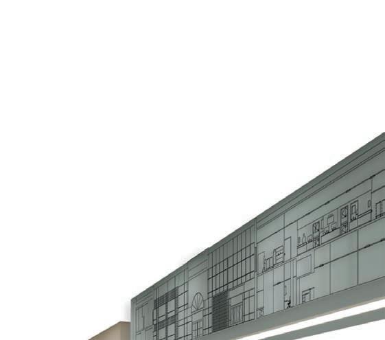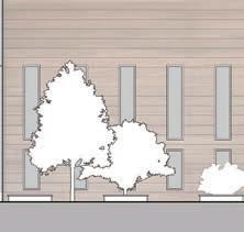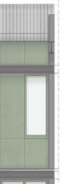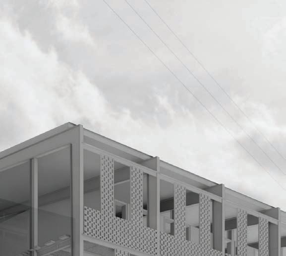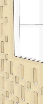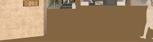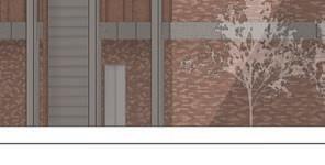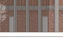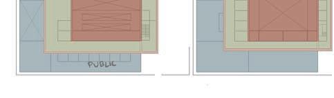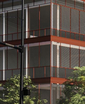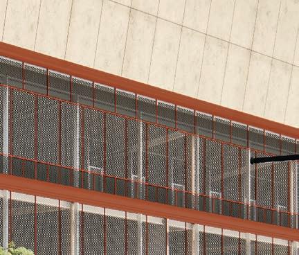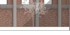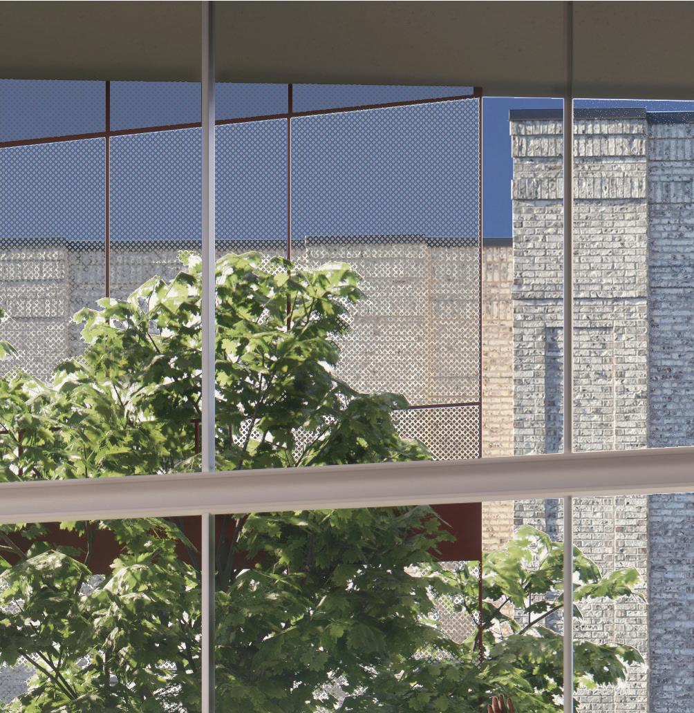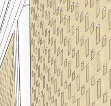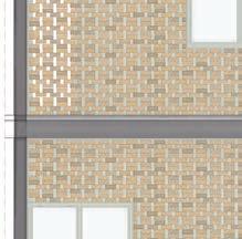 elements become infilled with brick to create a shell around the building that perforates at the streetfront into a screen. The urban fabric is thus held at the street, but it invites participants into a layered community. The screen also hints at the inner façade, pulling away at the window openings at the threshold. Residential and retail bars act as two inner objects, both layered with metal façades. These layers of construction create layers of interaction established as the public sphere becomes more private moving into the site.