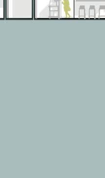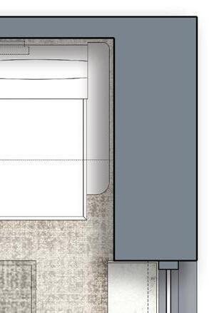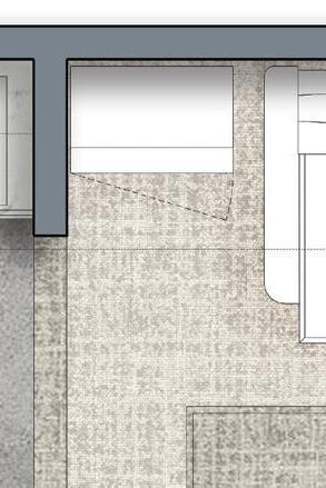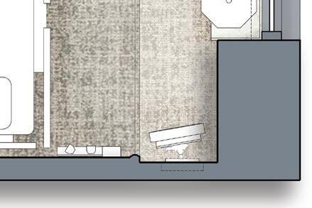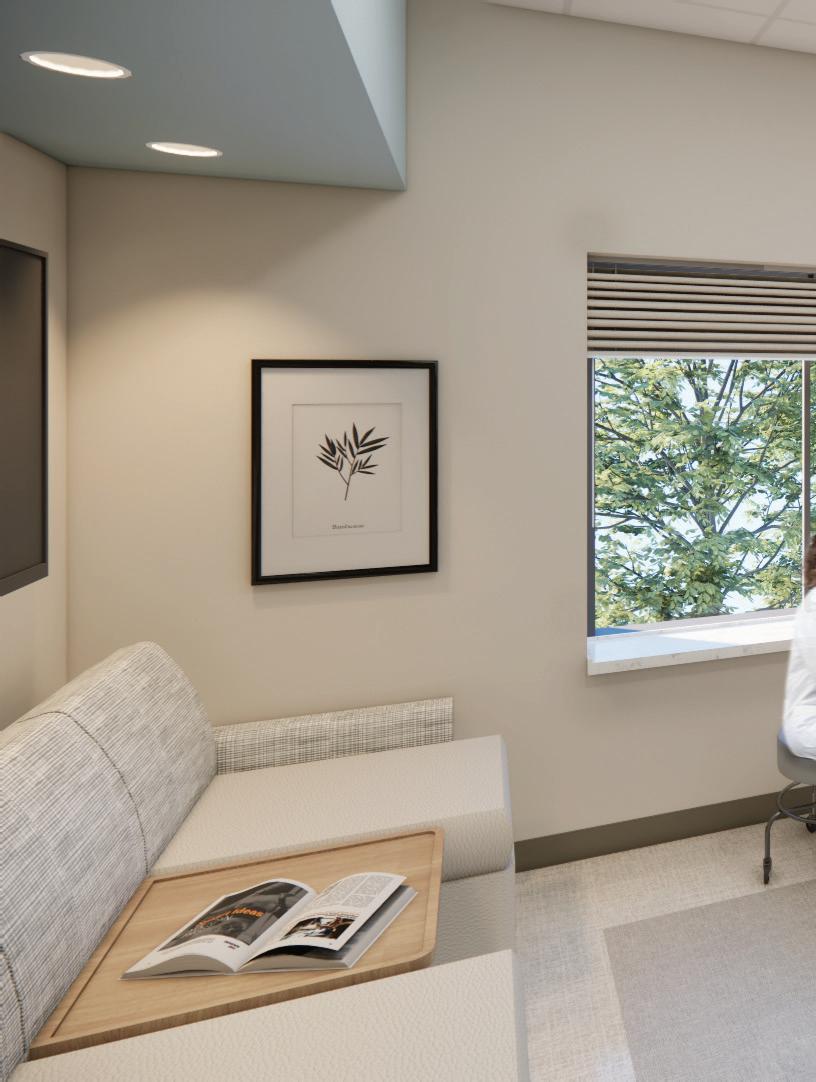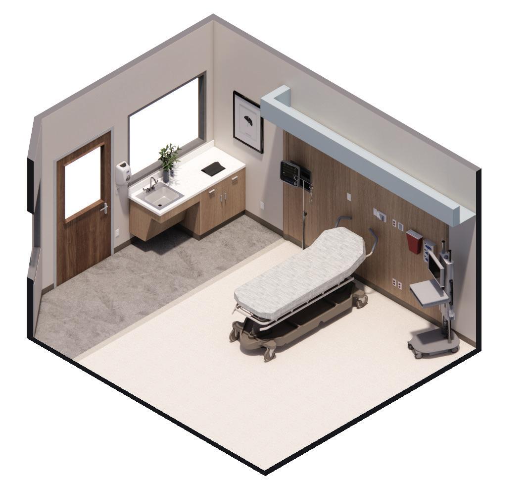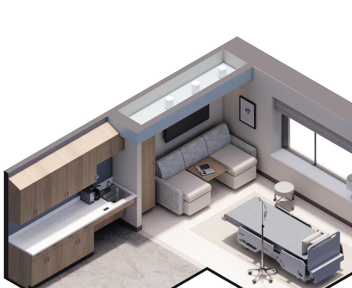 Treatment continues into the progressive care unit, or non-critcal area. These twelve rooms reside along the exterior face of the building for natural light responses into the recovery spaces. The layout allows quick access from the expansive nurses’ station into every room. Ample storage pairs with the connected bathroom to maximize space within the confines of the existing shell. Adjacent to the headwall, the family nook provides a lowered soffit with soft lighting, personal storage, and a specifically designed sleep couch with a direct view to the window. This proximity to the patient encourages interaction and care while accommodating family needs.