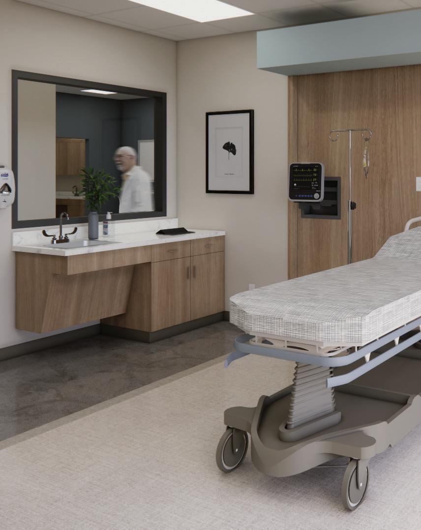 In both departments, the finishes seek to instill a calming environment. Sheet vinyl flooring remains continuous but changes colors for wayfinding, while identical solid surfaces, casework, and lighting choices minimize distractions. Paired to a gentle toned color palette, the ICU continues to express a clean environment intent on caring for both patients and their families.