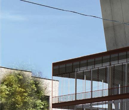The southwest site entry welcomes the public from downtown Austin into the landscape. A ramped entry sequence guides visitors to the series of buildings: an auditorium, recreational facility, and an exhibition space. Every building utilizes locally-sourced rammed earth modules. The auditorium maintains these thick walls along the exterior stairway to the lookout. This element seeks to connect the existing landscape with the movement of the museum buildings. The exhibition similarly recognizes movement as the exterior ramp transitions into an interior