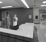The ICU unit maintains four registered critical beds, a complete nurses’ station with connected nutrition and supplies, and staff support with lounge and on-call rooms. The programmatic arrangement situates these patient rooms along the existing curtain walls, creating a singular double-loaded corridor with viewpoints from the nurses’ station into every room for safety and assurance.