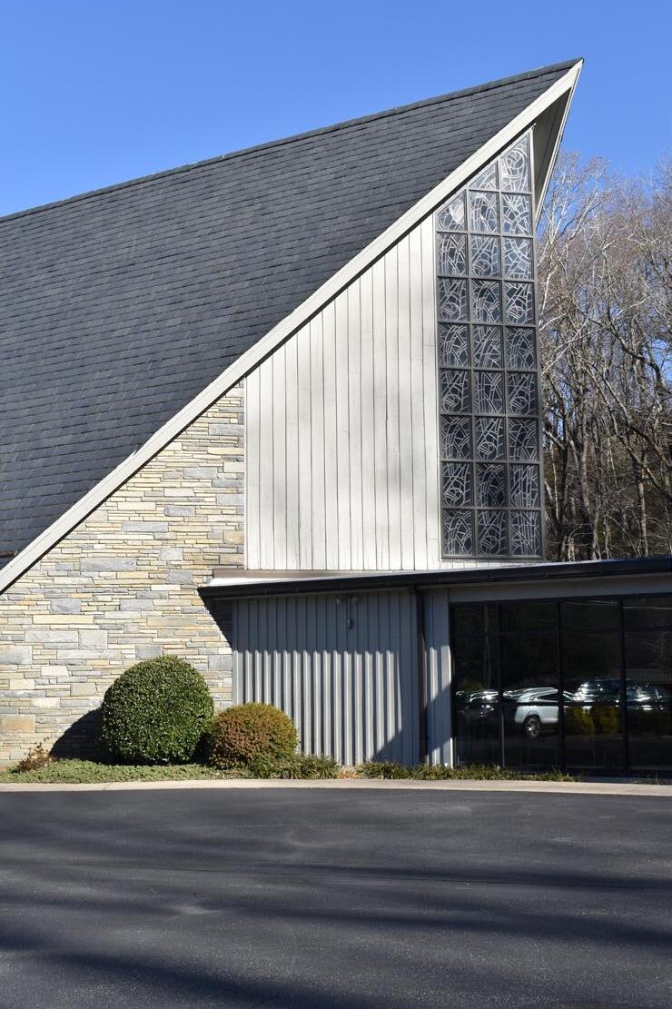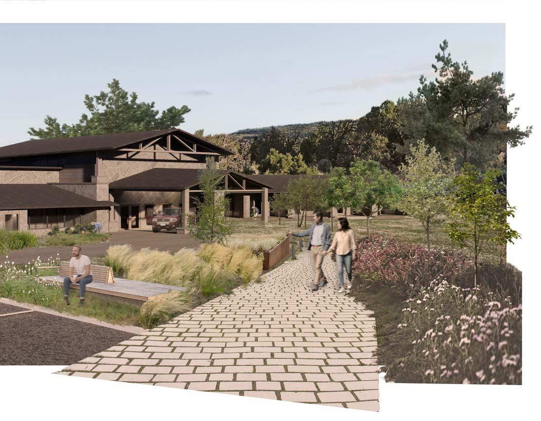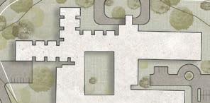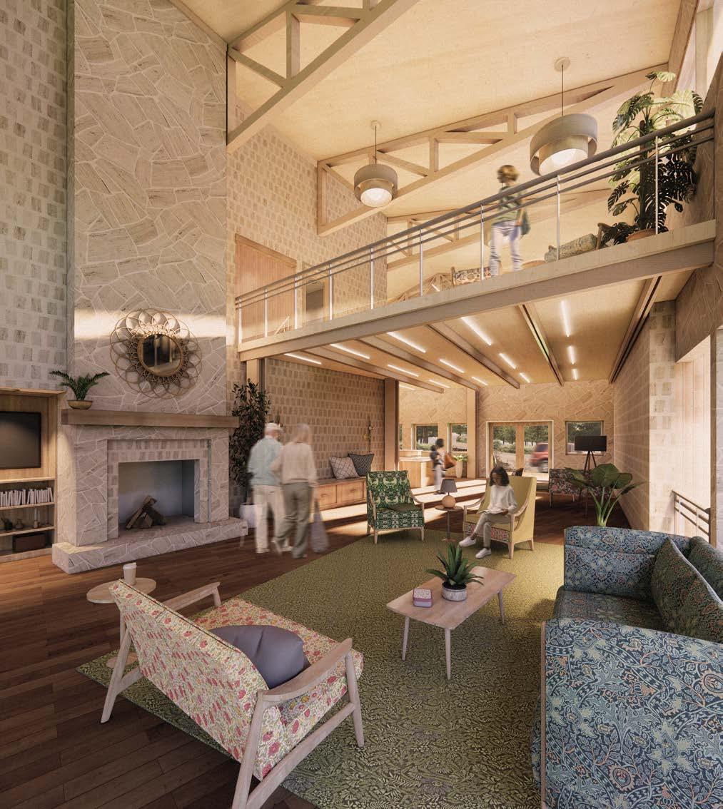 Roof—Pitched roofs provide domestic motifs and clerestory views from patient rooms
