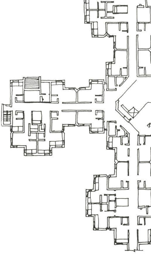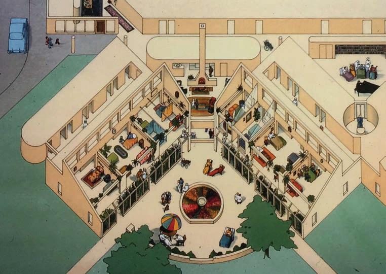 Figure 12: Fentress, Clare. Robert Conrad and Lo-Li Chan, cutaway axon of southern half of the Connecticut Hospice, 1976. Courtesy of Lo-Li Chan. Drawing. “The Avery Review: Staff Needs: The Spaces of Hospice.” averyreview.com/issues/62/staffneeds.