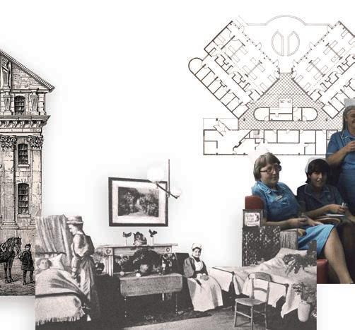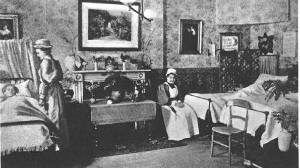 In response to the poor conditions of the almshouse, St. Luke’s Home for the Dying and Poor provided specific care for the terminally ill in London. Founded by Dr. Howard Barrett in 1893, the philosophy of care differed greatly from the custodial approach of the typical almshouse.8 Barrett sought to emphasize the individuality of his patients, writing that “each one is a human microcosm, with their own characteristics, their own aggregate of joys and sorrow, hopes and fears, their own life history.”9 This core value introduced one of the first documented ward layouts intentionally arranged for patient-centered care. As nurses admitted new patients, an “undetected rotation” moved the sickest patients closest to the nursing station and entrance, reducing distress at time of death.10 The home occupied several different locations across London from 1893 through 1903 as Barrett sought to find a building matching these ward ideals, retrofitting a variety of housing types. He es-