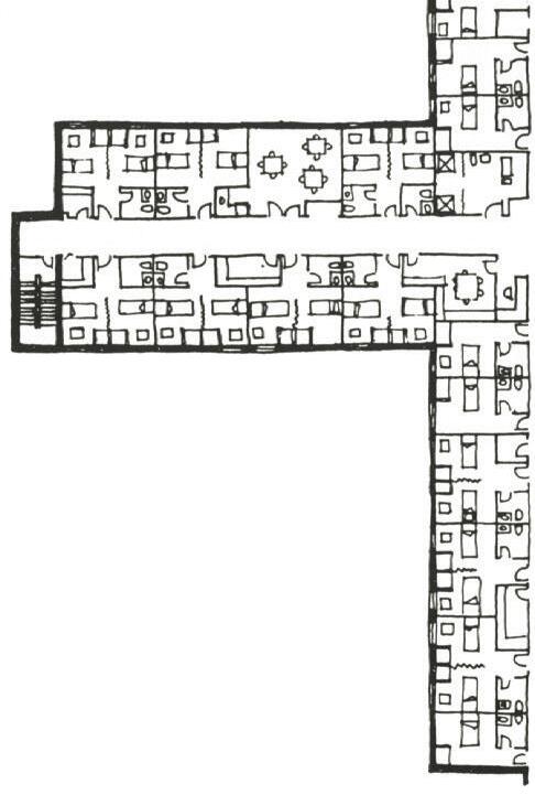 As rural pilgrimage traditions faded and urban populations grew in the eighteenth century, almshouses emerged as a solution to hospitals and asylums overcrowded with the infirm and elderly.5 This new typology rescued the destitute elderly by providing communal care. Residents, referred to as “pensioners,” lacked family and monetary support, relying on the almshouse for refuge.6 These institutions were typically adapted houses or similarly styled buildings arranged around courtyards. Supervisions within these facilities required linear wings with long corridors and open rooms. Although conditions for the physical building varied widely, the intentional space for the elderly portrays the first attempt of acknowledging the aging population. This model for community housing continued until after World War II when the rise of the architectural International Style and medical standardization laws shaped these institutions into the modern nursing home.7