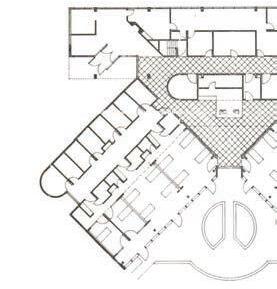 Institutional spine maintains entry and staff spaces for offices, lockers, kitchen, and pharmacy