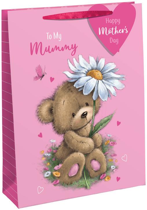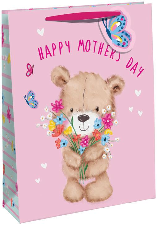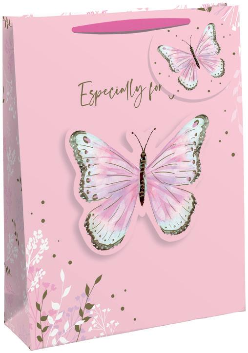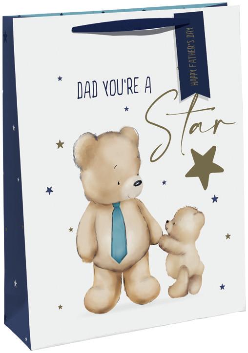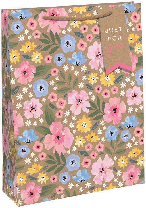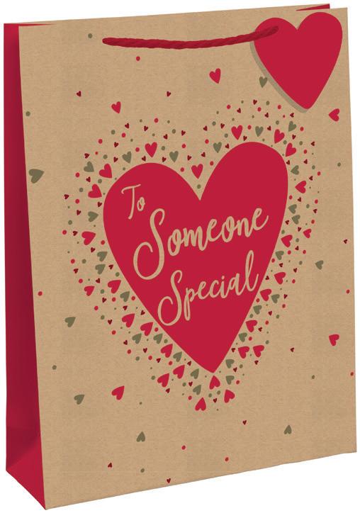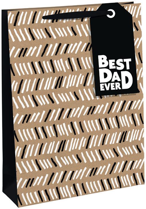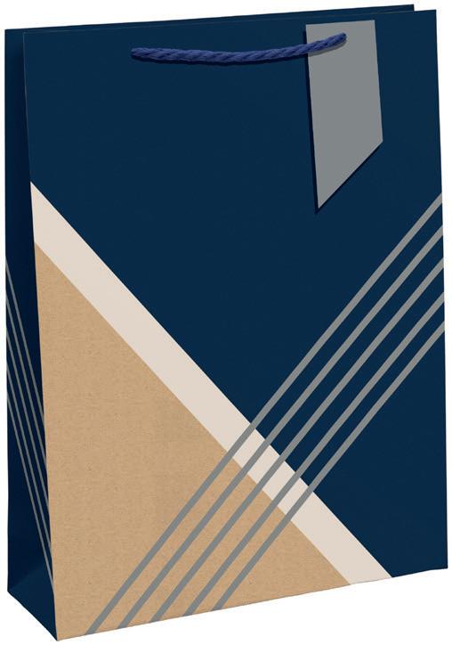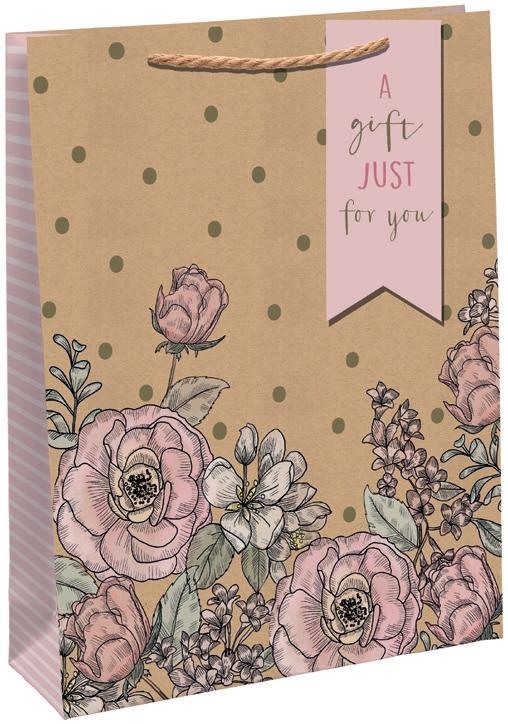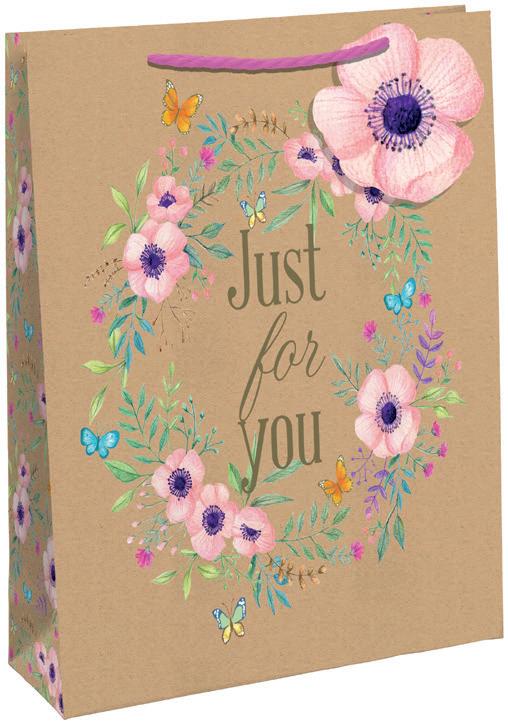 210gsm, Textured white kraft paper, foil finish, grosgrain handle.
