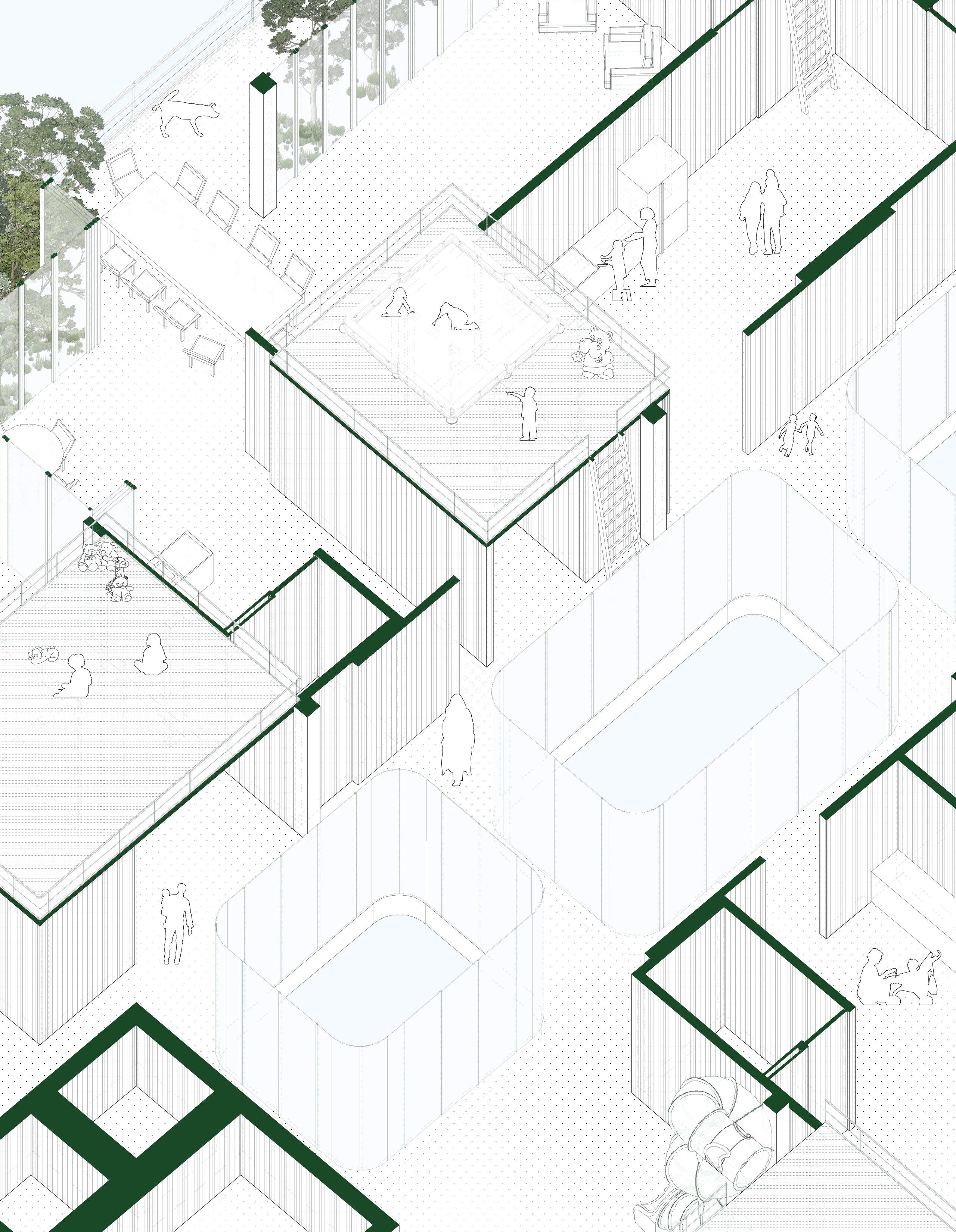 This housing project is intended to serve individuals estranged from the traditional family structures, this includes but is not limited to: children, single parents, recently-widowed spouses, and elders. Through the shared living framework implemented in our design, the exchange of care and support among residents becomes the foundation of everyday life. In its entirety, the project would eliminate barriers to socialization for young single parents by creating a playful housing community that connects them to one another and to the older generation.