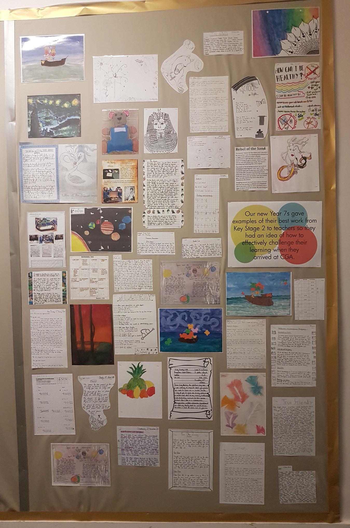 We have created an ‘Arrive with a Dream’ display from the best pieces of Year 6 work that our new Year 7s gave us last year. This display is in the entrance to the Nightingale Hall where we have most of our assemblies and events that parents can come to so it is seen by a lot of people all the time!