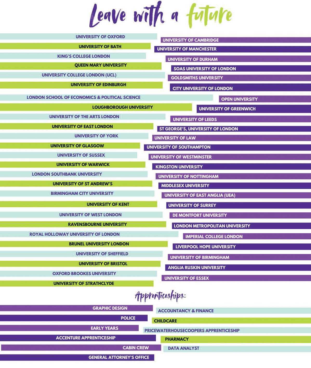 Many of our students gain places at Russell Group universities and other prestigious institutions, as well as going into apprenticeships.