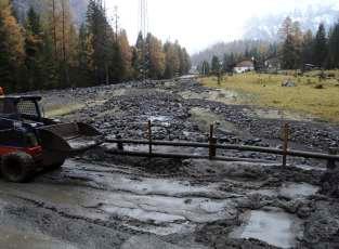 1 - Massa fangosa nei pressi del Garni Roberta a Malga Ciapéla, prontamente rimossa con l'ausilio di bobcat Si tra a della frazione più fine delle grandi colate di detrito scese dai fianchi vulcanicidellacatenadelSassdeRoi(fotoLucaDarman).