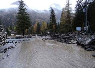 11 - Il piccolo ruscello (Ru de Roi) ingrossato dai detri trasporta dalle acque tumultuose ha oltrepassato la sede stradale a nord di Malga Ciapéla contribuendo a bloccare il transito sulla statale per ilPassoFedaia(fotoLucaDarman).