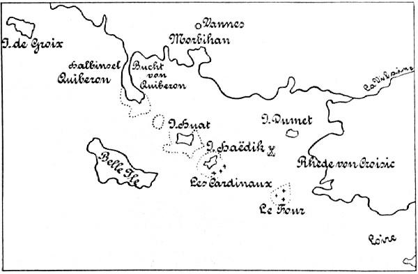 dem Entschlusse, die ganze Kraft der Marine auf ein Ziel zu richten, auf den Einfall in England. Mit dem Kriegsminister, Marschall von Belle-Isle, entwarf er folgenden Plan[82]: Von Ostende aus sollten auf eigens dazu erbauten flachen Fahrzeugen 20 000 Mann unter General de Chevert nach der Mündung des Blackwater, nordöstlich von London, übergeführt werden; ein gleichstarkes Heer unter dem Herzog d'Aiguillon sollte bei Vannes gesammelt, in der Morbihanbucht[83] eingeschifft und in Schottland gelandet werden; ein kleineres Korps endlich wollte man von Dünkirchen aus nach Irland werfen, da man hier auf einen allgemeinen Aufstand rechnete. Die vereinigten Seestreitkräfte von Brest und Toulon — 35 bis 40 Linienschiffe — waren bestimmt, unter Marschall de Conflans zuerst die Expedition nach Schottland zu führen und dann den Übergang nach England zu decken; für die Überführung nach Irland waren nur einige Kriegsschiffe vorgesehen. — Schon im Winter 1758/59 wurde mit den Vorbereitungen zu diesem großen Unternehmen begonnen, aber Beratungen über den Plan, Mangel an Geldmitteln, sowie der schlechte Zustand der Werften und Arsenale verzögerten die Ausführung; erst spät im Sommer glaubte man sich bereit. Inzwischen aber war eine Hauptsache, die Vereinigung der Toulonflotte mit den Streitkräften des Atlantik, durch die Schlacht bei Lagos verhindert, und England hatte Zeit zu nachdrücklichsten Abwehrmaßregeln gefunden.