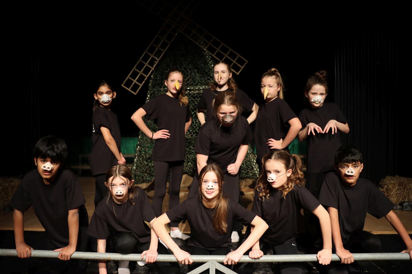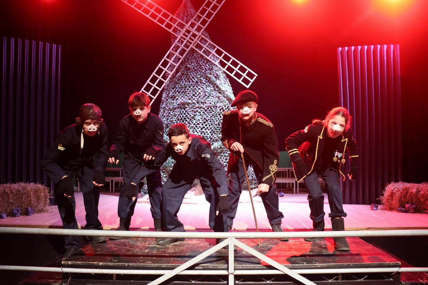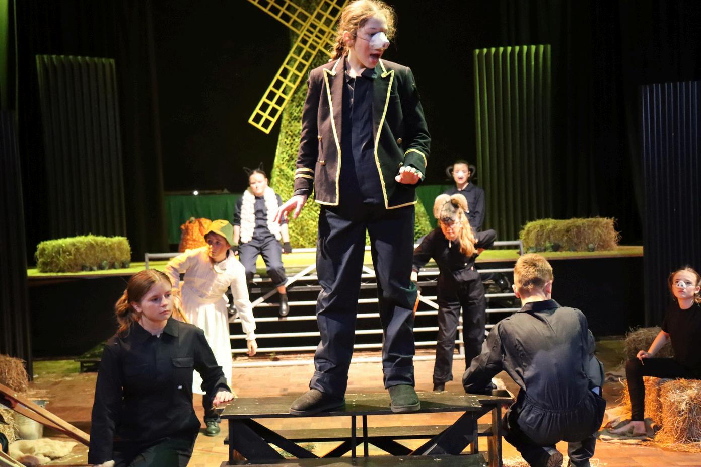 The recent production of Animal Farm showcased the remarkable talents of pupils from almost all year groups, who collaborated seamlessly behind the scenes and on stage. With a dedicated team handling everything from lighting and directing to stage management, under the careful guidance of Mrs Rose, the effort was a testament to their collective maturity and commitment. The cast delivered a faultless performance, with each actor bringing depth to their roles, contributing to the powerful storytelling that captivated the audience. The unique staging of the show, enhanced the experience, allowing for a more immersive connection with the narrative Their creativity and passion truly brought the story to life, leaving a lasting impression on the audiences.
