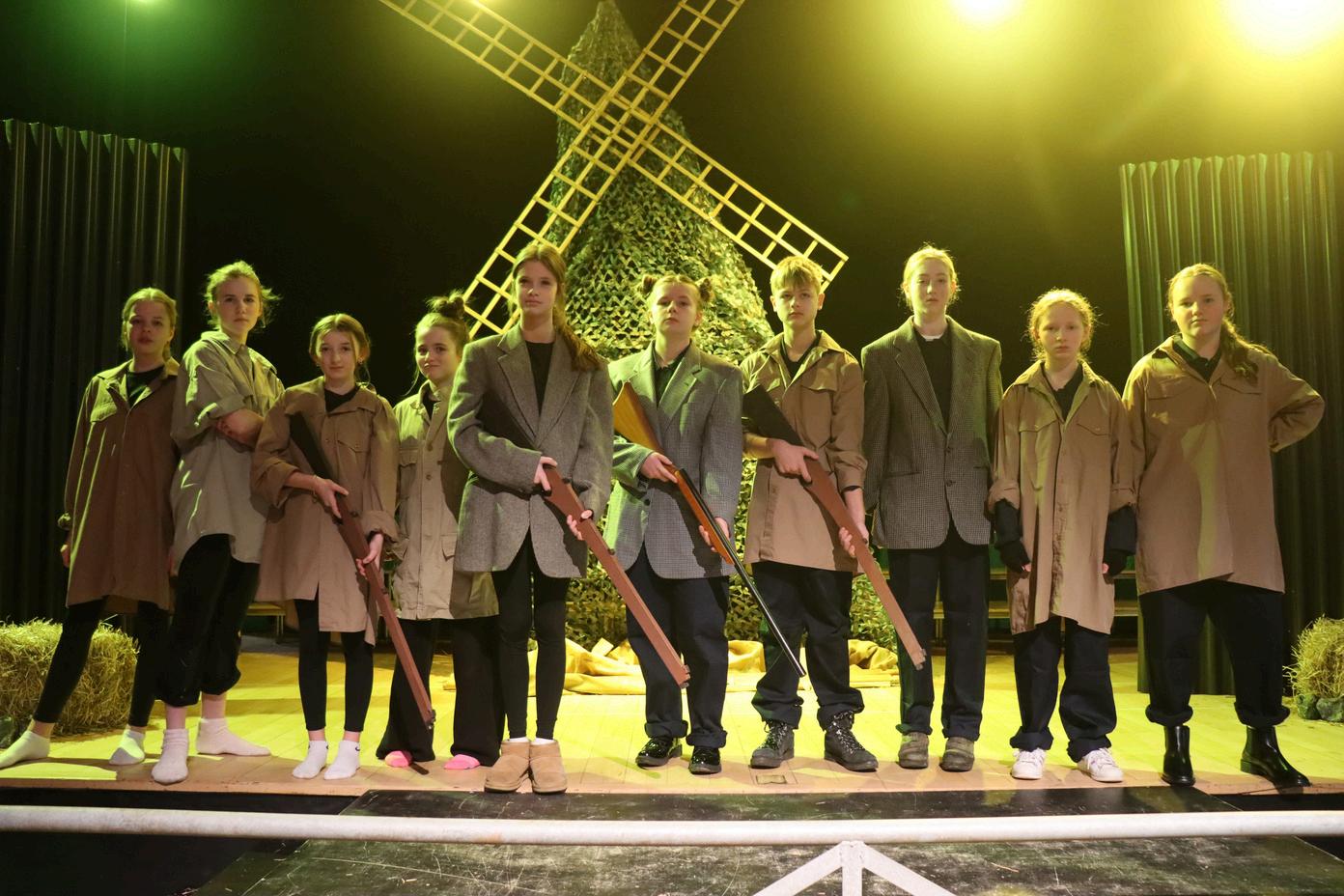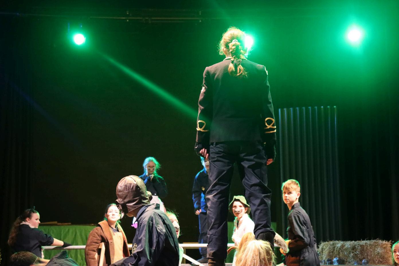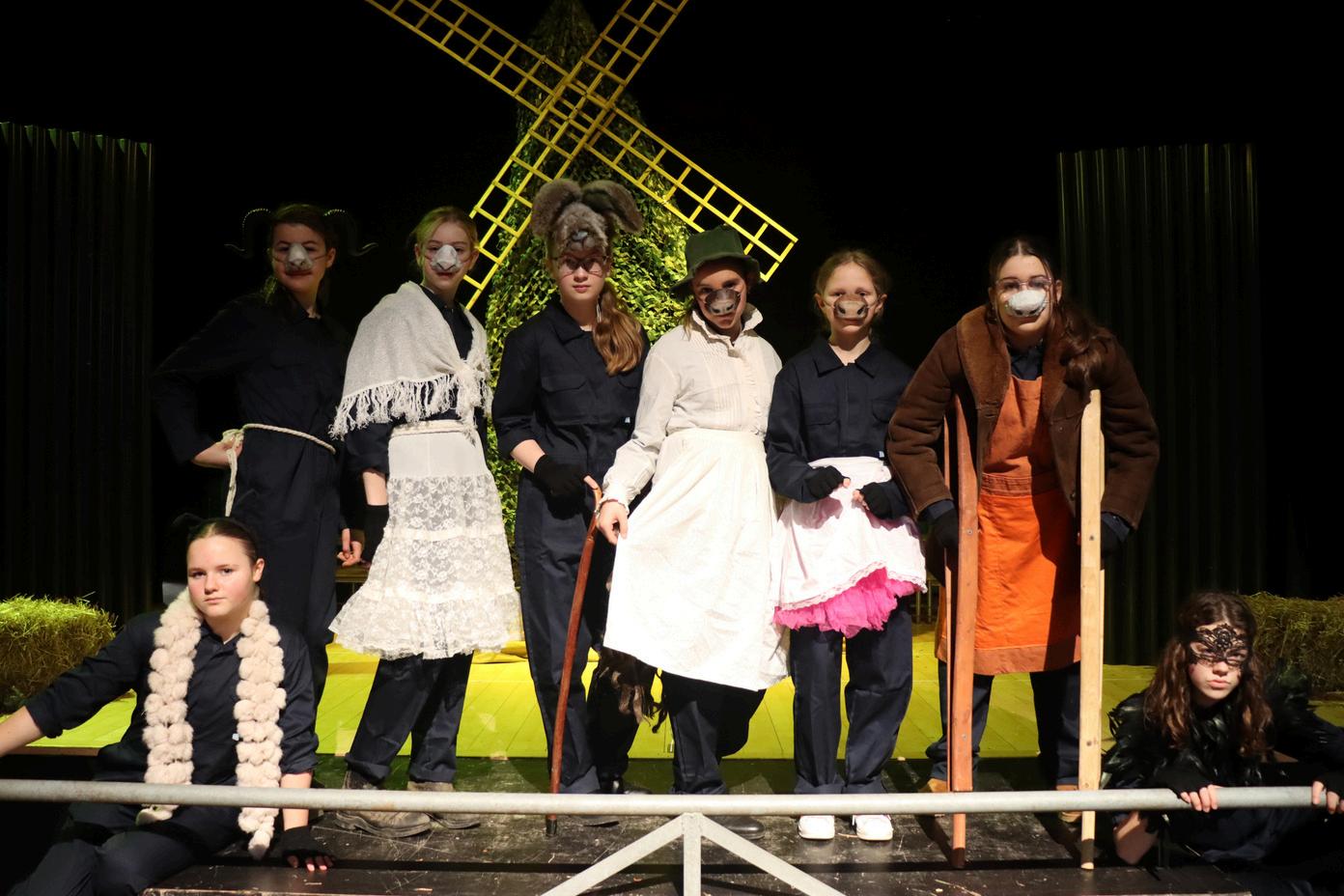 The recent production of Animal Farm showcased the remarkable talents of pupils from almost all year groups, who collaborated seamlessly behind the scenes and on stage. With a dedicated team handling everything from lighting and directing to stage management, under the careful guidance of Mrs Rose, the effort was a testament to their collective maturity and commitment. The cast delivered a faultless performance, with each actor bringing depth to their roles, contributing to the powerful storytelling that captivated the audience. The unique staging of the show, enhanced the experience, allowing for a more immersive connection with the narrative Their creativity and passion truly brought the story to life, leaving a lasting impression on the audiences.