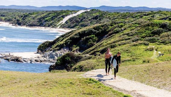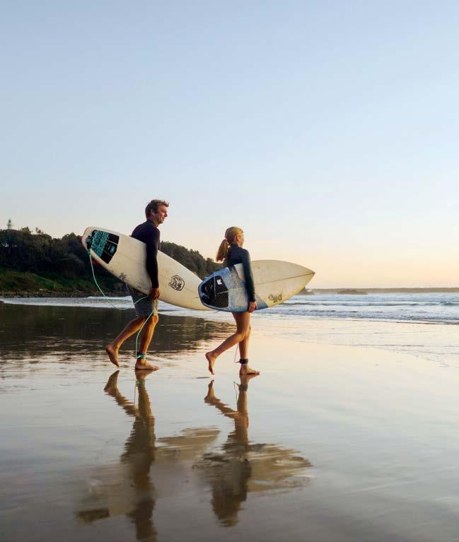 Iluka Bluff offers spectacular views over the Pacific Ocean, perfect for whale watching and enjoying a wellearned picnic after your adventure. Bring your bikes, boards, and fishing gear to enjoy the ocean and river. Rumour has it that Iluka Beach is the place to show off your angling prowess, but we aren't making any promises! Nature’s splendour continues in Bundjalung National Park, offering fishing, hiking, camping, and kayaking along the Esk and Jerusalem Rivers. As the sun sets, unwind at Woody Head Campground, a tranquil spot with unspoiled beaches and the soothing rhythm of the ocean.