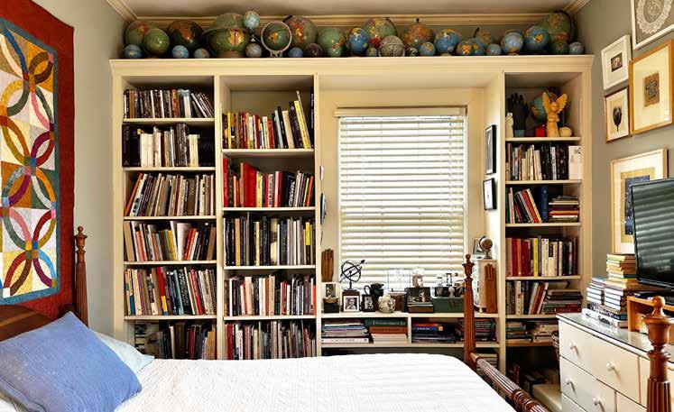 And they both love books, which fill every inch of the living room’s built-in bookshelves before spilling out onto tables and floors.