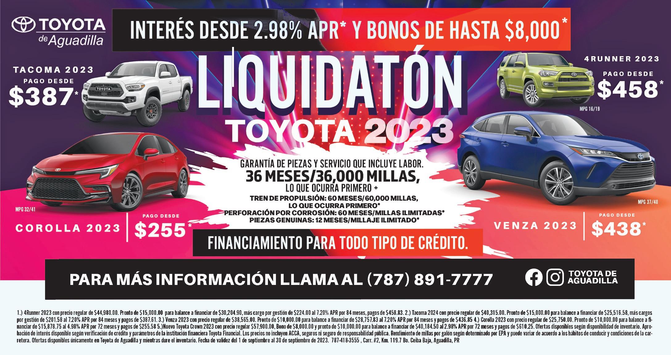 Aceite y filtro de por vida aplica a 2023 Corolla. 4. 2023 Corolla HB (32 MPG) Precio de Venta $34,995. Bono de $4,000. # Stock 826072. Pago mensual de $174.98 al 2.99% APR a 84 meses. Financiado a través de Toyota Financial Credit. 5. 2023 RAV4 (30 MPG) Precio de Venta $36,995. BONO $2,500. Unidad 94943. Pronto de $17,100. Balance a financiar $17,395. Pago mensual de $198 al 5.99% APR a 84 meses. Financiado a través de Toyota Financial Credit. Sujeto a aprobación de crédito. Empírica 795+. Bono de $3,000 aplica a 2023 Rav4 X LE. Precio de venta $39,995. 6. 2023 Corolla (33 MPG) Precio de Venta $30,995. BONO de $3,500. Unidad 00769. Pronto de $18,500. Balance a Financiar $8,995. Pago mensual de $118 al 5.99% APR a 84 meses. Financiado a través de Toyota Financial Credit. Sujeto a aprobación de crédito. Empírica 795+. 7. 2023 Tacoma (18MPG)- Precio de Venta $47,995 BONO $5,000. Unidad 820505. Pronto de $21,200. Balance a financiar $21,795. Pago mensual de $285 al 5.99% APR a 84 meses. Financiado a través de Toyota Financial Credit. Sujeto a aprobación de crédito. Empírica 795+. Ninguna oferta puede ser combinada con otra. Ciertas restricciones aplican. Sujeto a aprobación de crédito. Ofertas válidas hasta el 30 de septiembre de 2023 o mientras duren las unidades. 787-303-1265 Llama POWERED BY Automotive Group CON HONESTIDAD, INTEGRIDAD, RESPETO Y COMPROMISO de por CONFIANZA VIDA Ofertas fuera de este mundo Aquí el buen servicio no termina con la venta. PAGOS HASTA DICIEMBRE2023 2 $0 GASTOS EN ACEITE Y FILTRO DE POR VIDA3 $0 GASTOS EN ASISTENCIA EN LACARRETERA por 10 años1 $0 $118mens. 2023 COROLLA6 33 MPG BONO $3,500 $174mens. 2023 COROLLA HB4 32 MPG BONO $4,000 $285mens. BONO $5,000 $198mens. 2023 RAV45 30 MPG BONO $3,000 2023 TACOMA7 18 MPG