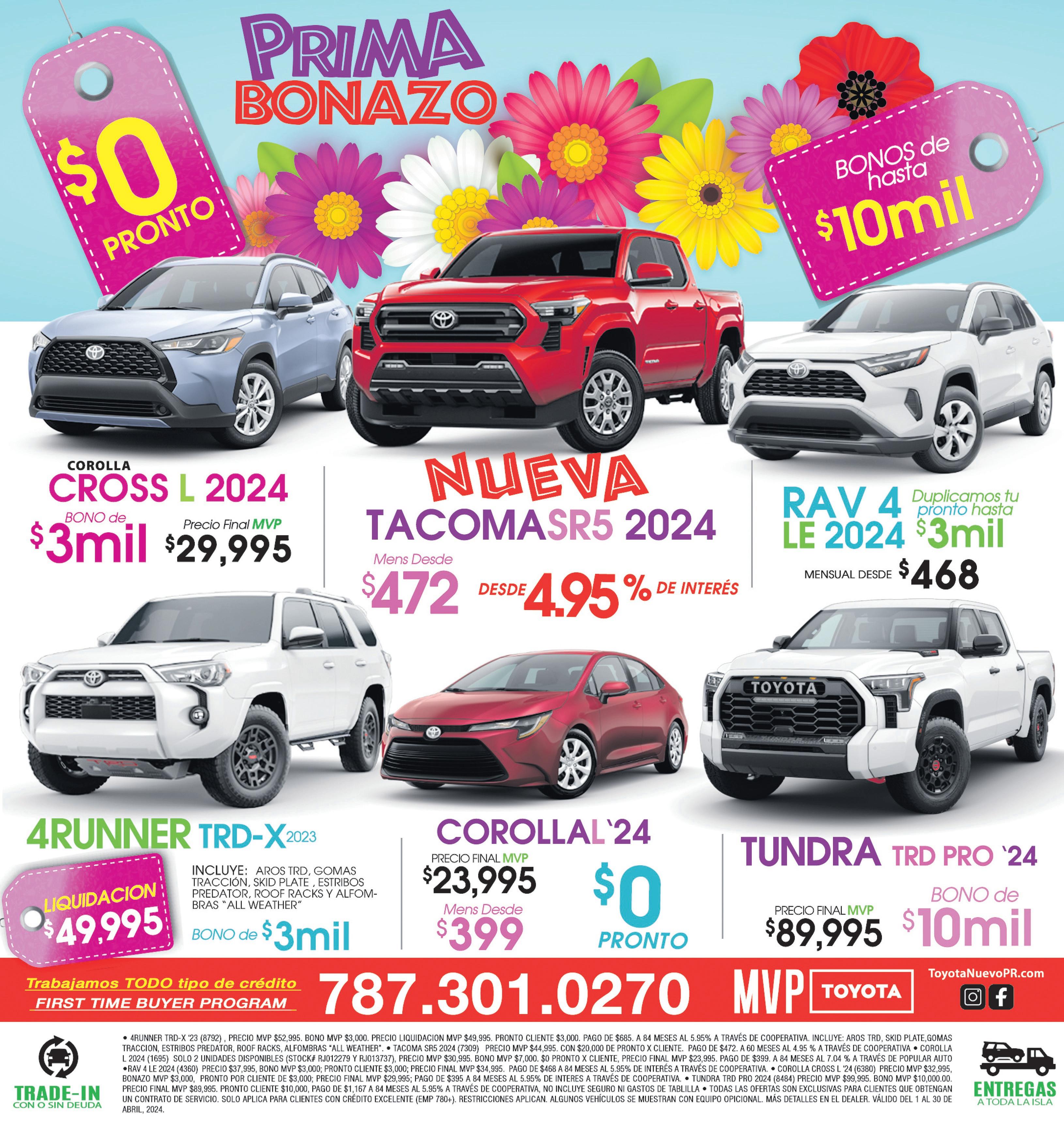 ificados.pr EL NUEVO DIA | JUEVES, 18 DE ABRIL DE 2024 5 Antigua Lotería Jardín Botánico Toyota de Puerto Rico Pollo Tropical Walgreens Autocentro Toyota Río Piedras Hacia Río Piedras Hacia Caguas Avenida Muñoz Rivera Avenida 65 de Infantería Avenida Piñero Autocentro Nissan 787-303-1265 Llama POWERED BY PAGOS 2 MESES ACEITE Y FILTRO DE POR VIDA3 AÑOS DE ASISTENCIA EN LA CARRETERA 1 10 CON GARANTÍA DE POR VIDA APR 4 pagos por tres meses aplica a clientes elegibles del Tier 1+, 1 y 2 a un máximo de 78 meses. No se requiere pronto. Para clientes con score de 750+ elegibles el primer pago será diferido por 90 días desde la fecha de inicio 0.98% APR a través de Toyota Financial Credit. 5. 2023 ROGUE S- (RO-2300) desde $29,995. 6. 2024 SENTRA (SE-2401) Stock# 221832. Precio de venta $30,995. BONO $5,000. Pronto de $15,000. Pago mensual de $4,000. Pronto de $16,000. Pago mensual de $134 al 6.84% APR a un término de 84 meses. Financiado a través de Oriental Bank. Empírica de 800+. Sujeto a aprobación de crédito. 8. 2024 VERSA (VES-2403) Stock# crédito. 9. 2024 Toyota Corolla. Precio desde $23,397 aplica a Stock #16933. 10. 2024 RAV4 - Stock #845463. Precio de Venta $37,995. BONO $3,000. Pronto de $23,250. Balance a nanciar $11,745. Pago mensual de Unidad 1922. Pronto de $26,600. Balance a nanciar $34,395. Pago mensual desde $579 a 84 meses. Financiado a través de Toyota Financial Credit. Sujeto a aprobación de crédito. Empírica 795+. 12. Legales del cintillo 6.34% APR a través de Popular Auto. Sujeto a aprobación de crédito. Prep Charges $895. Empírica 795. Desde 1.91% APR aplica a RAM Warlock 2023 Stock # 591462. Sujeto a aprobación de crédito y se requiere empírica mientras duren las unidades. TACOMA 2024 Separa la tuya hoy y recibe $2,000 9 2024 COROLLA | $23,397 33MPG Precio desde 102024 RAV4 | $175 mens. 30 MPG desde $3,000 DE BONO 112024 GRAND HIGHLANDER | $579 mens. 37MPG desde $8,000 DE BONO DE BONO