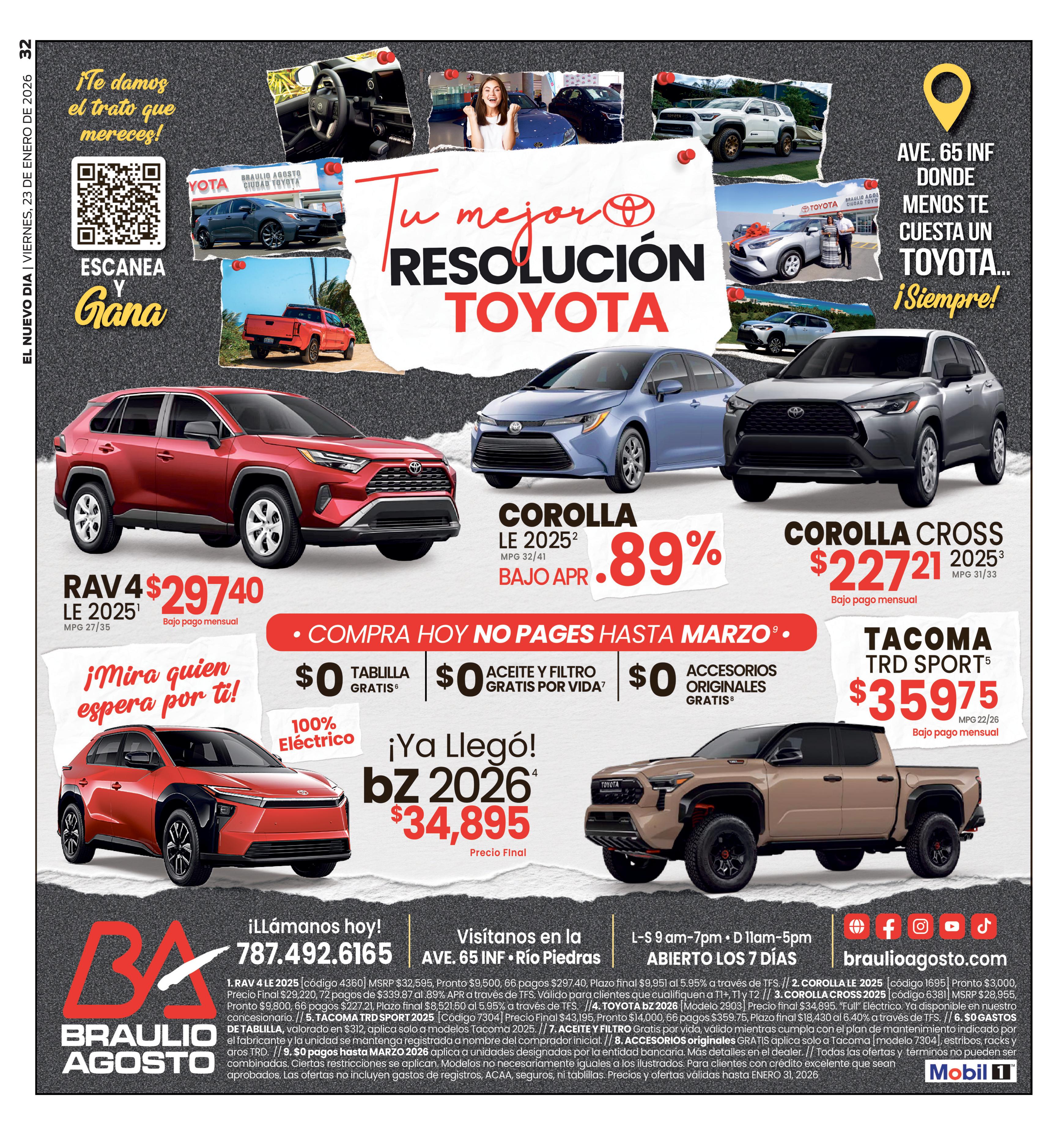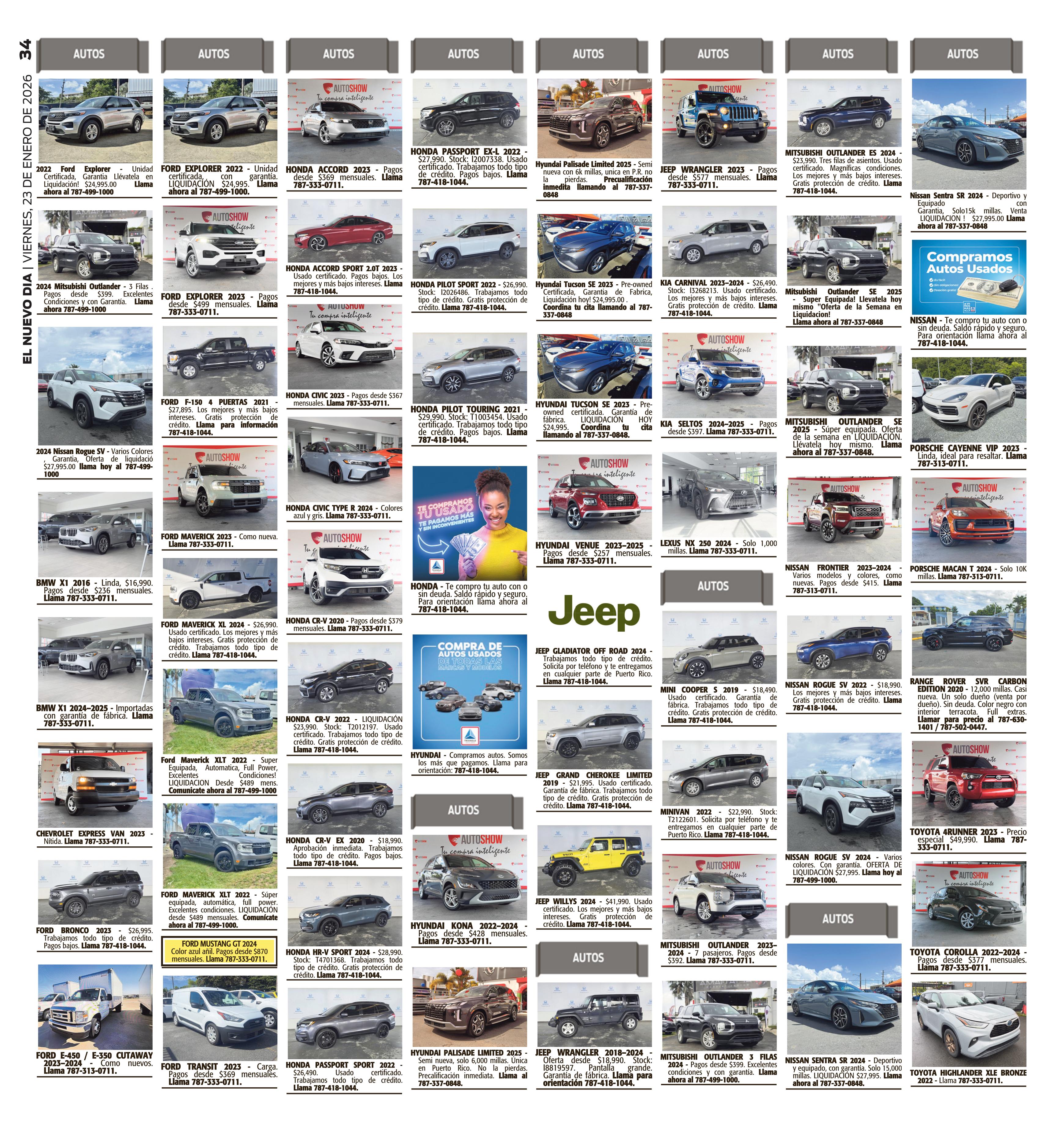 los primeros doce meses. Pagos mensuales subsiguientes $482.12. Pronto $5,000. Residual $12,598. Balance a financiar $31,890 a 60 meses. Pre. Charges $895. Sujeto aprobación de crédito. Empírica 795+. 4. Jeep Wrangler 2025. Stock 648694. Precio de venta: $47,995. Pronto: $5,000. Pago de $399 los primeros 12 meses y los subsiguientes $677.19. Financiado por Popular Auto al 6.25% a 60 meses y se requiere 795+. 5. Desde 0% APR aplica a 2025 GRAND CHEROKEE. Stock #SC350538. Precio de Venta $59,995. Pago mensual $1,003. Balance a financiar $59,995. Financiado a través de Toyota Financial Credit al 0% APR a 60 meses. Sujeto aprobación de crédito. Empírica 795+. Además aplica a 2026 RAM WARLOCK. Stock #TN202615. Precio de Venta $57,995. Pago mensual $838. Pronto $8,000. Balance a financiar $72,394.98.