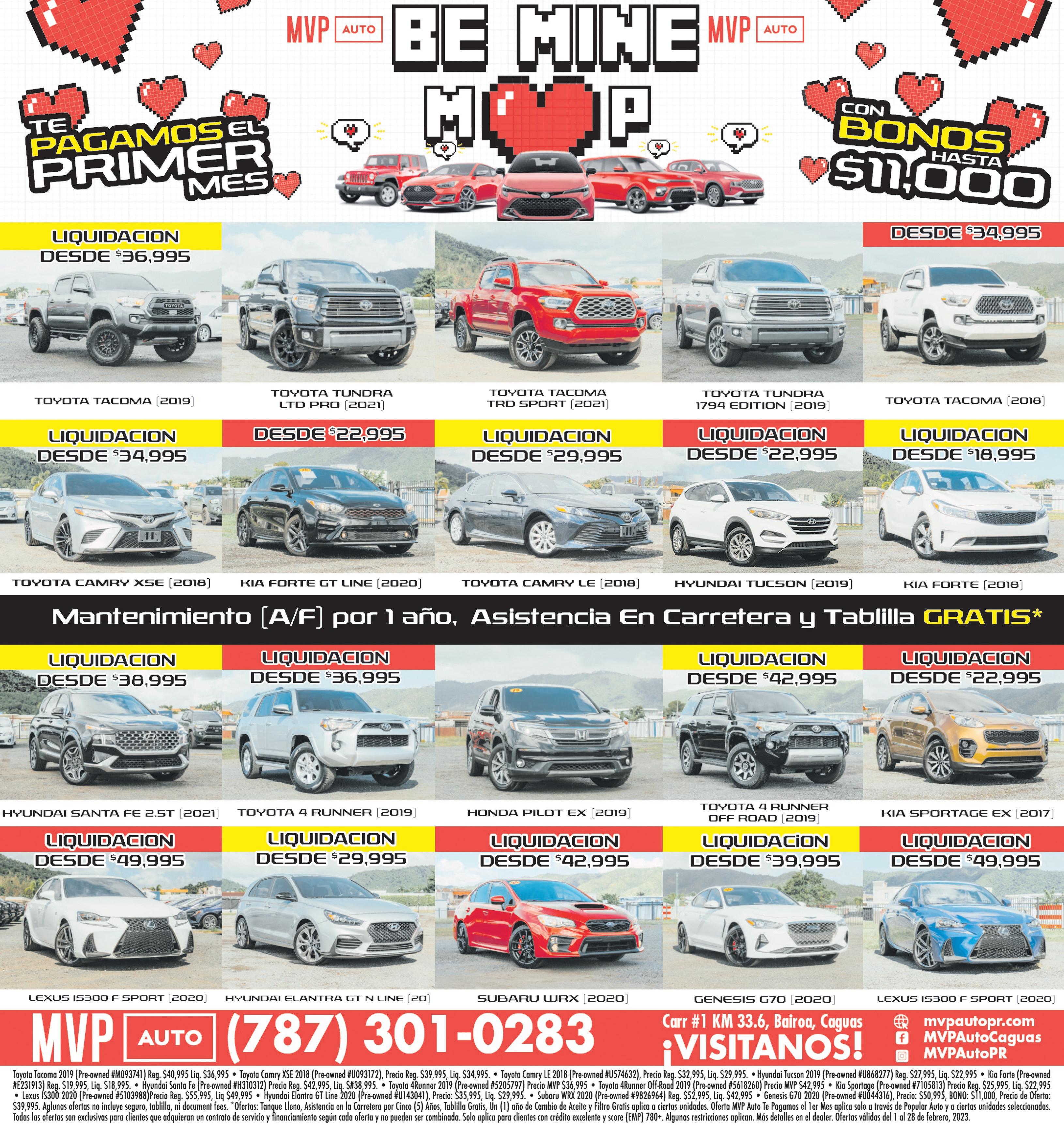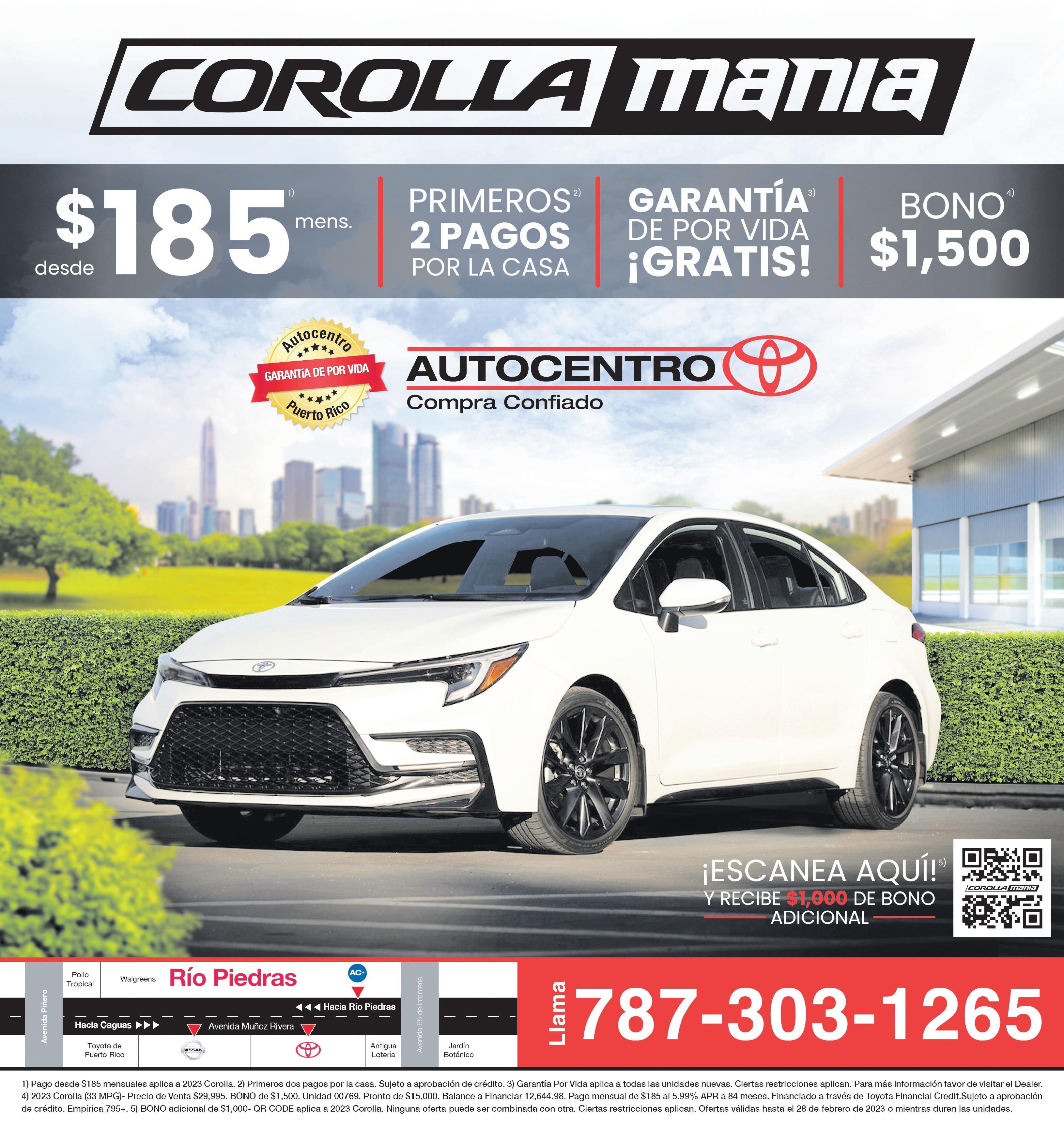 Financial Credit. Sujeto a aprobación de crédito. crédito. Empírica 795+. 14. 2023 Tacoma (18MPG)- Precio de Venta $46,995. BONO $3,500. Unidad 25302. Pronto de $24,000. Balance a nanciar $19,729.98. Pago mensual de $288 al 5.99% APR a 84 meses. Financiado a través de Toyota Financial Credit. Financial Credit. Sujeto a aprobación de crédito. Empírica 795+. Sujeto a aprobación de crédito. Ninguna oferta puede ser combinada con otra. Ciertas restricciones aplican. Ofertas válidas hasta el 15 de febrero de 2023 o mientras duren las unidades. Autocentro Nissan 787-303-1265 Llama Antigua Lotería Jardín Botánico Toyota de Puerto Rico Pollo Tropical Walgreens Autocentro Toyota Río Piedras Hacia Río Piedras Hacia Caguas Avenida Muñoz Rivera Avenida 65 de Infantería POWERED BY Automotive Group 2023 HIGHLANDER 15 $398 mens. 24 MPG $3,000 DE BONO 2023 RAV4 13 $200 mens. 30 MPG $1,250 DE BONO 2023 TACOMA 14 $288 mens. 18 MPG $3,500 DE BONO 2023 COROLLA 12 $185 mens. $2,500 DE BONO 33 MPG Perfecto Perfecto Perfecto