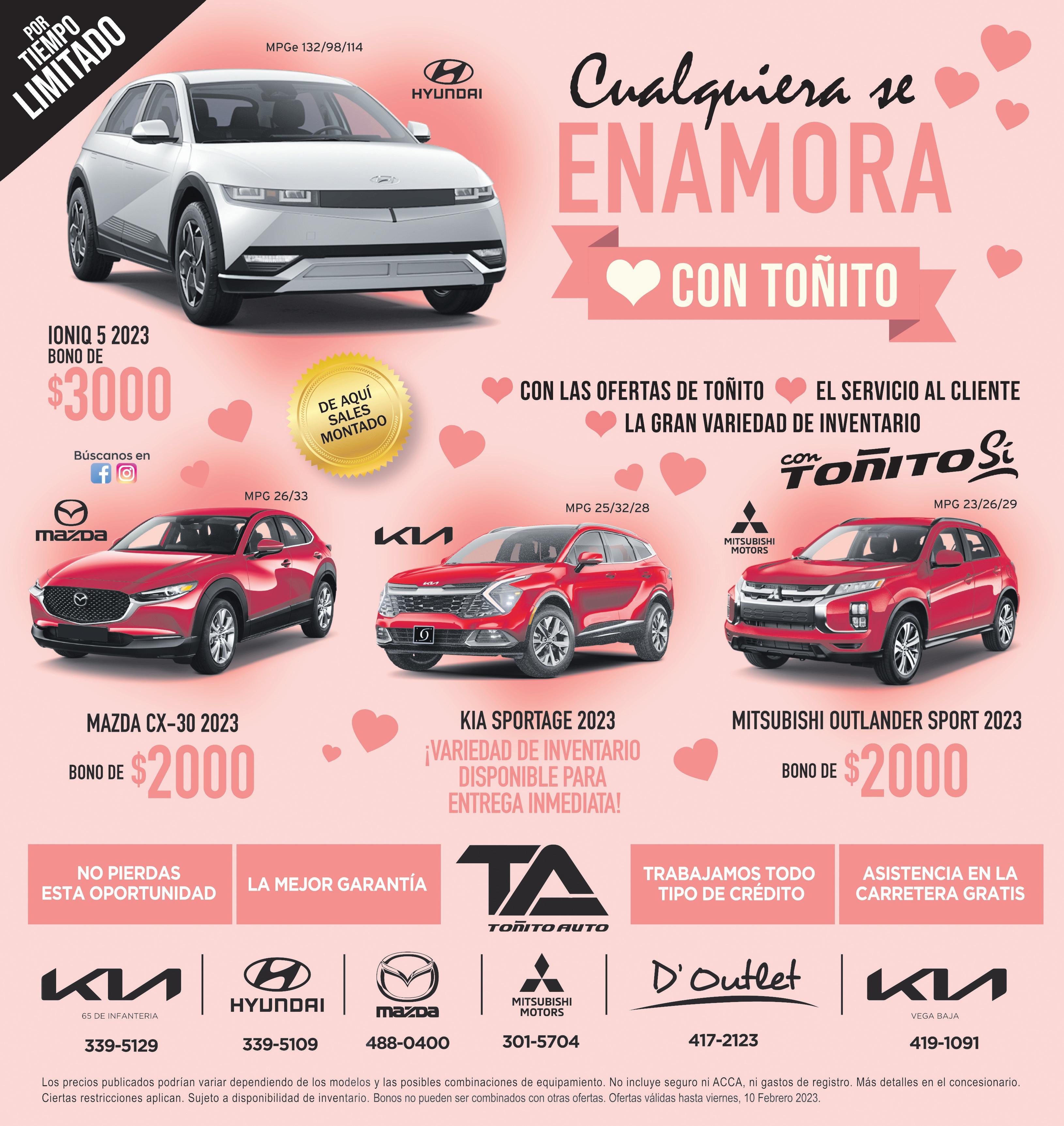 6 EL NUEVO DIA | MIÉRCOLES, 8 DE FEBRERO DE 2023 www.clas BONO DE HASTA 5 12,000 $ GASTOS DE ACEITE Y FILTRO6 POR 5 AÑOS 0 $ GASTOS DE ASISTENCIA EN LA CARRETERA POR 10 AÑOS3 0 1. Garantía Por Vida aplica a todas las unidades nuevas. Ciertas restricciones aplican. Para más información favor de visitar el dealer. 2. Pagos desde $99 aplica a 2023 Versa – (MPG 32/40) (VS-2203) Precio de Venta $24,995. BONO $2,000. Pronto de $16,600. Pago concesionario. 5. Bono $12,000 aplica a 2022 Frontier – (MPG 18/24) (FC-2202) #181000 Precio de Venta $52,995. BONO $12,000. Pronto $14,900. Pago mensual de $399 al 7.15% APR a un término de 84 meses. Financiado a través de Toyota Financial Credit. 6. Gratis BONO $12,000. Pronto $14,900. Pago mensual de $399 al 7.15% APR a un término de 84 meses. Financiado a través de Toyota Financial Credit. 9. 2023 Rogue – (MPG 27/35) (RO-2300) Precio de Venta $39,995. BONO $4,000. Pronto de $16,250. Pago mensual de Financiado a través de Toyota Financial Credit. 11. 2023 Versa – (MPG 32/40) (VS-2203) Precio de Venta $24,995. BONO $2,000. Pronto de $16,600. Pago mensual de $99 al 7.15% APR a un término de 84 meses. Financiado a través de Toyota Financial Credit. 12. 2023 Empírica 795+. 13. 2023 RAV4 (30 MPG)- Precio de Venta $31,995. Pronto de $17,000. BONO $1,250. Unidad 94943. Balance a nanciar $13,904.98. Pago mensual de $200 al 5.99% APR a 84 meses. Financiado a través de Toyota Financial Credit. Sujeto a aprobación Sujeto a aprobación de crédito. Empírica 795+. 15. 2023 Highlander (24 MPG)- Precio de Venta $50,995. Pronto de $21,000.00. BONO $3,000. Unidad 28769. Balance a nanciar $27,249.98. Pago mensual de $398 al 5.99% APR a 84 meses. Financiado a través de Toyota CON HONESTIDAD, INTEGRIDAD, RESPETO Y COMPROMISO de por CONFIANZA VIDA AÑOS 2022 FRONTIER 8 $399 mens. 18/24MPG $12,000 DE BONO 2023 ROGUE 9 $299 mens. $4,000 DE BONO 27/35 MPG 2023 KICKS10 $159 mens. 31/36 MPG $3,000 DE BONO 2023 VERSA 11 $99 mens. 32/40MPG $2,000 DE BONO Perfecto Perfecto Perfecto