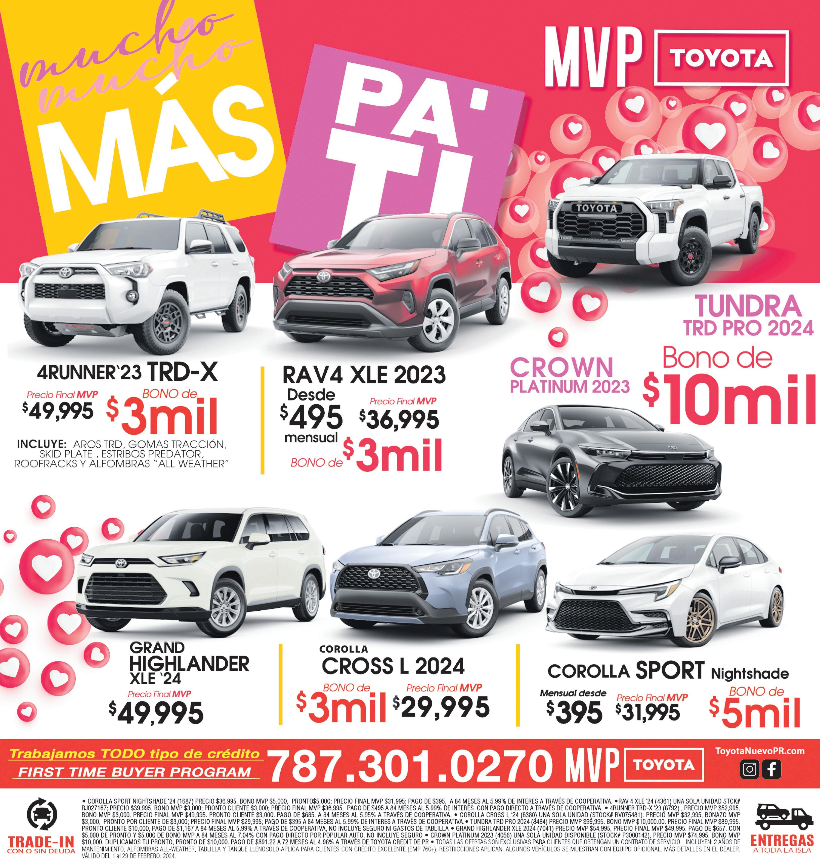 de Toyota Credit de Puerto Rico: Cliente escoge entre pago diferido hasta julio 2024 o crédito aplicable a precio; 0% o 1.98% APR hasta 36 meses del programa convencional de TFS para Tier 1Plus & Tier 1 & 2, aplica a modelos específicos; Dos (2) años de cambio de aceite y filtro con Toyota Care;. Un (1) año de gasolina gratis aplica a modelos híbridos (basado en consumo promedio); Cero desembolsos para gastos de tablillas. * Accesorios Incluidos aplican a Tacoma 2023 #806408. Más detalles en el concesionario; Las ofertas antes mencionadas no se combinan con otras ofertas ni las ofertas de COSTCO Auto Program. ONTIG CO DE EL7879057245POR ¡DEALERDEL AHORRO! CALESA TOYOTA .COM SOLOENCALESA TEDAMOSMÁS PORTUTRADE-IN ACCESORIOS INCLUIDOS A P R 3.95% $0 PAGOS hasta julio 20 24 * $0 * DESEMBOLSOS DE TABLILLA $0 * EN ACEITE Y FILTRO POR 2 A ÑOS $0 * PRONTO ¡CERO EXCUSAS AQUÍ TE APROBAMOS! COROLLA 2024 AL COSTO $24,995 (C) COROLLA CROSS 2024 MENS. $145 (C) RAV 4 2024 MENS. $178 TACOMA 2023 MENS. $275 COROLLA 2024 CON AROS Y SUNROOF AL COSTO $27,378(C)