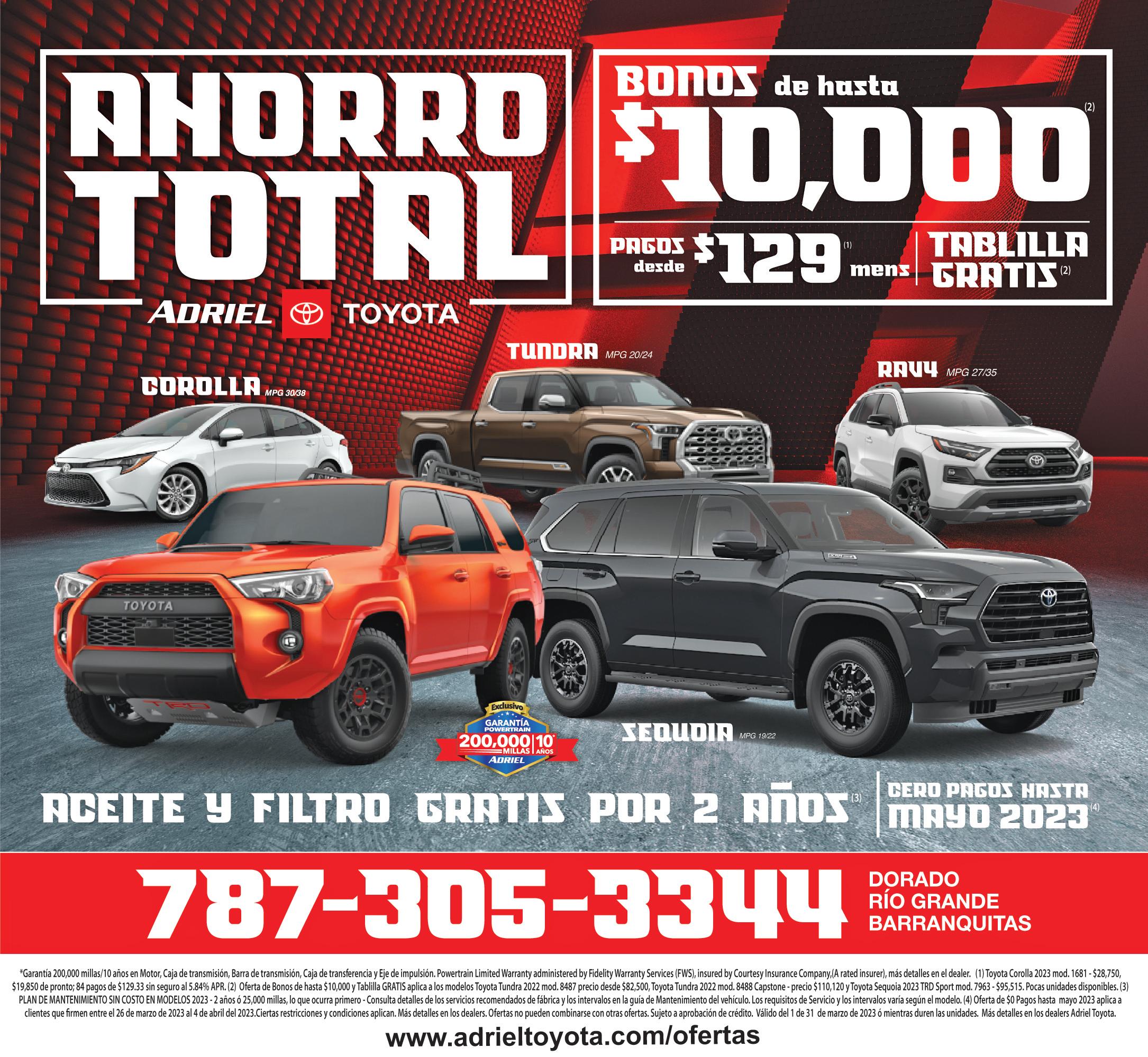 (1) 2023 Tacoma TRD Sport código 7304 MSRP $39,800, Pronto $19,500, Balance a Financiar $20,300. Primer pago de $521.08 y 83 pa gos de $307.08 , a través de Popular Auto al 7.04% de APR con pago directo, 820 mínimo puntuación para la oferta. (2) 2023 Corolla modelo 1681 MSRP $24,335, Pronto $9,500. Balance a financiar de $14,835 a través de BPPR con pago directo, pagos de $215, 820 mínimo puntuación para oferta. (3) RAV4 LE 2023 Modelo 4360, MSRP $31,095, menos Pronto de $12,500. Balance a financiar $18,595. Primer pago de $451.79 y 83 pagos de $281.29 al 7.04% de APR a través de Popular Auto, válido para clientes con 790 de empírica o más. (4) $0 gastos de tablilla en Tundra 2022. (5) Válido para clientes con 760 de puntuación crediticia o más para unidades 2021 financiadas a través de BPPR. (6) Aceite y Filtro gratis, válido mientras cumpla con el itinerario de mantenimiento establecido por el fabricante y la unidad se mantenga registrada a nombre del comprador inicial. (7) V álido para Tacoma 2023 modelo 7304. Ofertas no incluyen gastos de registros, ACAA, seguros, ni tablillas. Precio y ofertas sujetas a aprobación de crédito. Ofertas y términos no pueden ser combinadas. Precios y ofertas válidas hasta el 31 de marzo de 2023.
