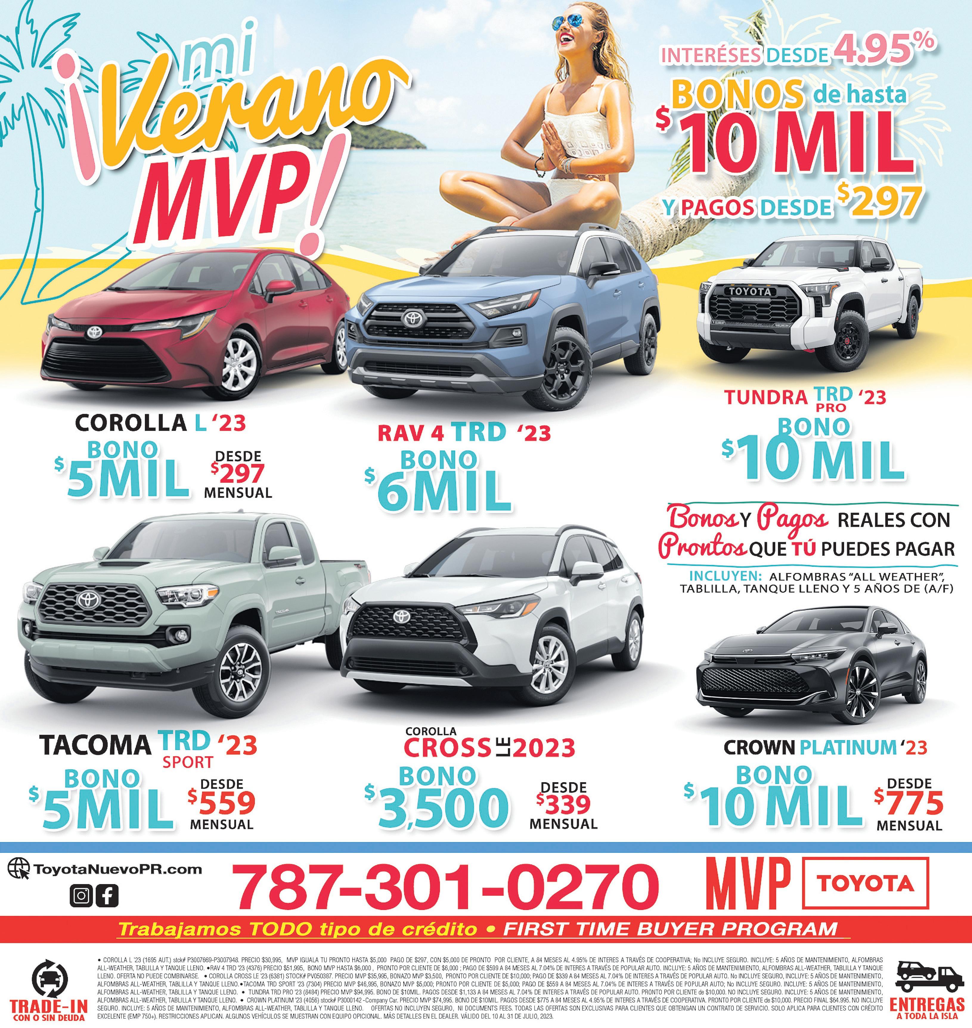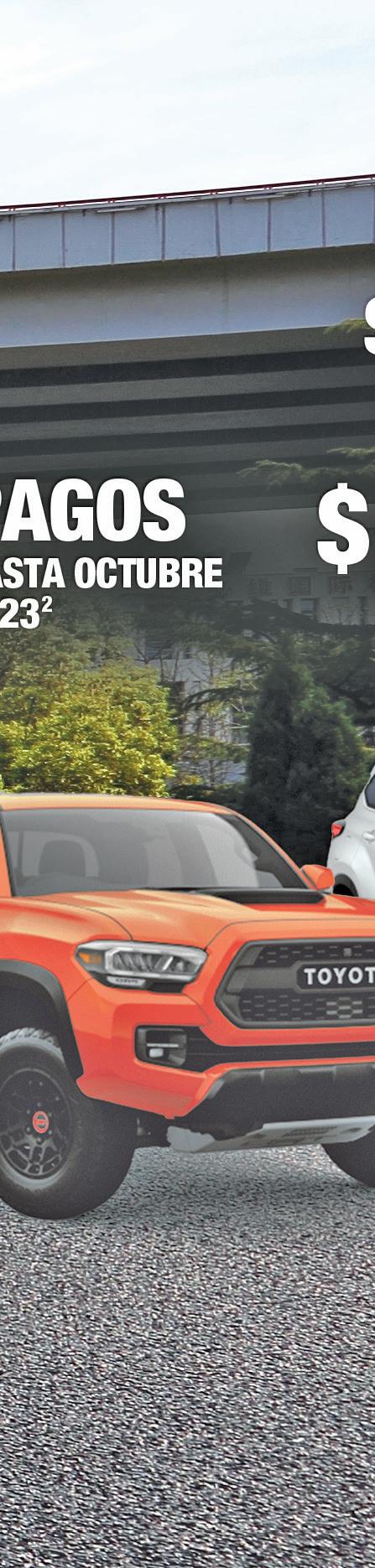 *Garantía 200,000 millas/10 años en Motor, Caja de transmisión, Barra de transmisión, Caja de transferencia y Eje de impulsión. Powertrain Limited Warranty administered by Fidelity Warranty Services (FWS), insured by Courtesy Insurance Company,(A rated insurer), más detalles en el dealer. (1) Toyota Corolla 2023 LE mod. 1695 - $27,950, $19,200 de pronto; 84 pagos de $129.26 sin seguro al 6.34% APR. (2) Toyota Rav4 2023 mod. 4360 - $36,420, $22,850 de pronto, 84 pagos de $200.46 sin seguro al 6.34% APR. (3) Toyota Tacoma 2023 mod. 7300 - $31,800, $12,125 de pronto; 84 pagos de $290.64 sin seguro al 6.34% APR. (4) Oferta de interés desde 3.98% APR a 60 meses aplica a todos los modelos Toyota Crown 2023 a través de Toyota Financial Services, Tiers 1 plus, 1 & 2. (5) Toyota Corolla HB 2023 mod. 6371 - $30,990; $20,850 de pronto, 84 pagos de $149.79 sin seguro al 6.34% APR.. (6) Toyota Highlander 2023 mod. 6881 - $49,950, $25,550 de pronto, 84 pagos de $360.44 sin seguro al 6.34% APR. (7) Oferta de cero pagos hasta septiembre 2023 aplica a clientes que rmen entre el 26 de julio de 2023 al 4 de agosto del 2023. (8) PLAN DE MANTENIMIENTO SIN COSTO EN MODELOS 2023 - 2 años ó 25,000 millas, lo que ocurra primero - Consulta detalles de los servicios recomendados de fábrica y los intervalos en la guía de Mantenimiento del vehículo. Los requisitos de Servicio y los intervalos varía según el modelo. Ejemplos no contemplan seguros, gastos de registros, ACAA, tablilla ni seguro de responsabilidad pública obligatorio. Sujeto a aprobación de crédito. Ciertos términos, restricciones y condiciones aplican. Otras tasas aplican a otras experiencias de crédito, según los parámetros y criterios establecidos por Oriental Bank, Miembro FDIC. Tasas de interés aplican sólo a través de debito directo con empírica de 780+, de no ser así se aumentará un .25% de interés. Ofertas válidas del 1 al 31 de julio del 2023 ó sujeto a disponibilidad de modelos antes mencionados mientras duren. Ofertas no pueden ser combinadas con otras ofertas. Oferta no es redimible en efectivo. Ciertas restricciones y condiciones aplican. Más detalles en los dealers Adriel Toyota.