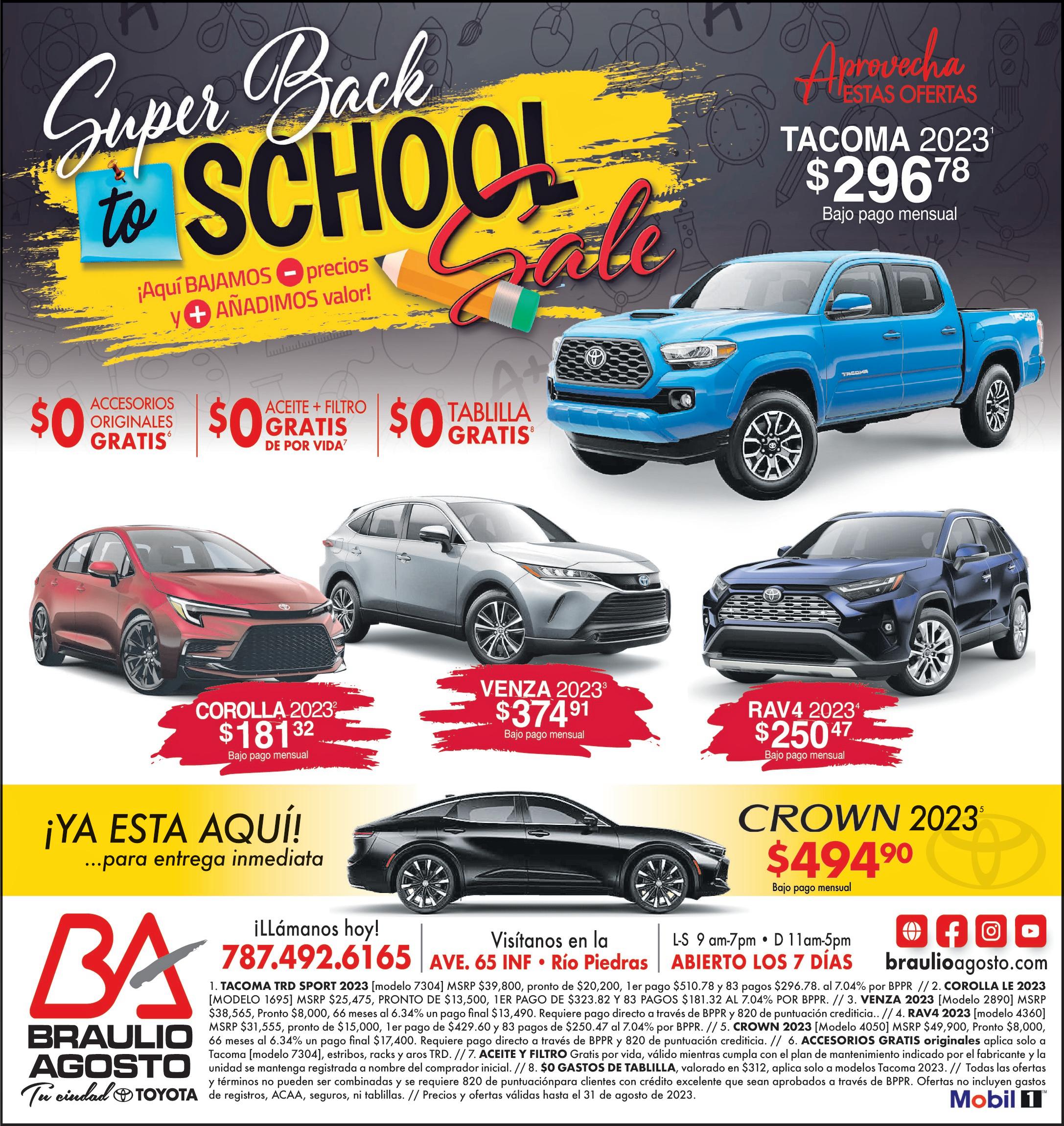 ificados.pr EL NUEVO DIA | SÁBADO, 5 DE AGOSTO DE 2023 7 BONO DE HASTA 3 12,000 $ GASTOS DE GASOLINA5 POR 1 AÑO 0 PAGOS HASTA NOVIEMBRE 2023 2 0 $ 2.99% APR 6 $83,995 Bono de 12,000. Balance a Financiar. $71,995. 4. Aceite y filtro de por vida aplica a 2023 Corolla. 5. Gasolina por 1 año, basado en consumo estimado según la EPA. 6. 2023 Corolla (33 MPG)- Precio de Venta $29,995. Unidad 00769. BONO $2,000. de vent a $57,045. Pronto de $15,000. BONO $5,000. Pago de $499 los primeros 12 meses al 6.25% APR a 60 meses. Pago de $440.33 los meses restantes. Residual de $19,966. Sujeto a aprobación de crédito. Empírica 784+. Oferta disponible a 2.99% 9. 2023 Kick s – (MPG 31/36) (KI-2300) Precio de Venta $27,995. BONO $3,000. Pronto de $15,000. Pago mensual de $159 al 4.99% APR a un término de 72 meses. Financiado a través de Popular Auto. 10. 2023 Versa – (MPG 32/40) (VS-2303). Precio de $19,500. Ba lance a Financiar $12,644.98. Pago mensual de $118 al 6.84% APR a 84 meses. Financiado a través de Oriental Bank. Sujeto a aprobación de crédito. Empírica 795+. 12. 2023 RAV4 (30 MPG)- Precio de Venta $31,995. Pronto de $17,100. $21,200. Balanc e a financiar $19,729.98 Pago mensual de $285 al 5.99% APR a 84 meses. Financiado a través de Toyota Financial Credit. Sujeto a aprobación de crédito. 14. 2023 Highlander (24 MPG)- Precio de Venta $50,995. Pronto de $28,500. BONO aplican. Sujeto a aprobación de crédito. Ofertas válidas hasta el 16 de agosto de 2023 o mientras duren las unidades. Autocentro Nissan 787-303-1265 Llama Antigua Lotería Jardín Botánico Toyota de Puerto Rico Pollo Tropical Walgreens Autocentro Toyota Río Piedras Hacia Río Piedras Hacia Caguas Avenida Muñoz Rivera Avenida 65 de Infantería Avenida Piñero POWERED BY Automotive Group 2023 TACOMA 13 $285 mens. $5,000 DE BONO 18 MPG 2023 RAV4 12 $198 mens. $1,250 DE BONO 30 MPG 2023 HIGHLANDER 14 $398 mens. $2,000 DE BONO 24 MPG 2023 COROLLA 11 $118 mens. $2,500 DE BONO 33 MPG
