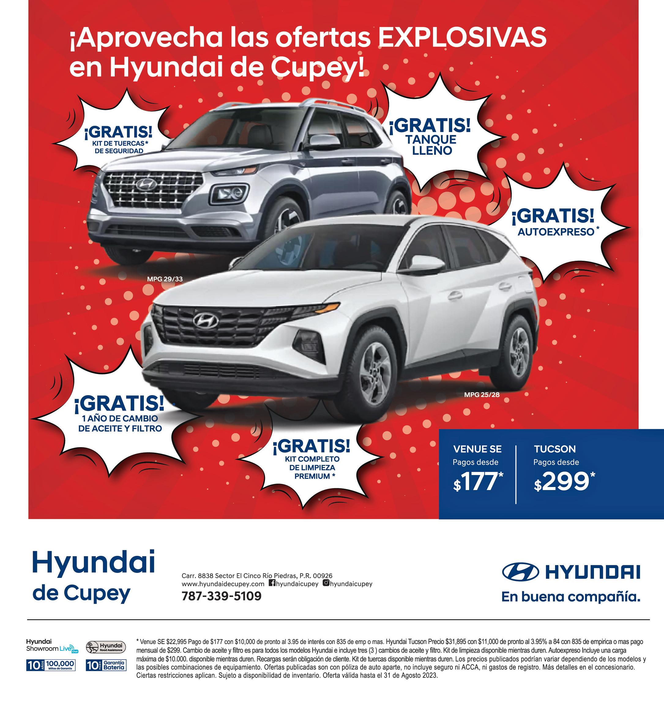 •Venue SE 2023 (SNW5D561VDD837)Stock #PU261938 una sola unidad disponible. MSRP $22,995. Pago de $189.00 a 84 meses al 5.95% de interés con pronto de cliente de $10,000. No incluye seguro. Incluye: Tablilla, tanque lleno, primer año de mantenimiento (A/F) • TUCSON SE (0AS42J61VSS163) MSRP $31,695. Pago de $499.00 a 84 meses al 5.95% de interés , con $0 Pronto. No incluye seguro. Incluye Tablilla, tanque lleno, primer año de mantenimiento (A/F) , Garantía 7 años o 100,000 millas bumper a bumper incluida en el pago. • Elantra SE 2023 (0AS42J61VSS163) Stock#PU604215 una sola unidad disponible. MSRP $23,295. Pago de $195 a 84 meses al 5.95% de interés con $10,000 de pronto. No incluye seguro, Incluye Tablilla, tanque lleno, primer año de mantenimiento (A/F) y además Hyundai Power Plus con los siguientes beneficios: (6) Mantenimiento cada 5 meses o 5K millas, Garantía de aros, neumáticos y parabrisas, Reemplazo de Llave y asistencia en la carretera. •Kona SE 2023 (J9W52J61VDD007) MSRP $25,895. Pago de $233 a 84 meses al 5.95% de interéscon $10,000 de pronto por cliente. No incluye seguro, Incluye Tablilla, tanque lleno y mantenimiento 1er año (A/F) •IONIQ 5 2023 (GIW5YC27ZHH006) Stock# PU132632 una sola unidad disponible. MSRP $60,190. Bono MVP $2,500. Pago de $697 a 84 meses al 5.95% de interés con $10,000 de pronto del cliente. No incluye seguro, Incluye Tablilla, tanque lleno y mantenimiento 1er año (A/F) •IONIQ 6 SE 2023 (ALS4ZHZ7ZDD004) Stock #PA029512 una sola unidad disponible. MSRP $46,995. Bono MVP de $1,500; Pago de $519 a 84 meses al 5.95% de interés , con $10,000 de pronto por cliente. No incluye seguro, Incluye Tablilla, tanque lleno y mantenimiento 1er año (A/F) *Ofertas Ofertas a través de Coopertiva Oriental solo para clientes con crédito excelente 760 de empírica