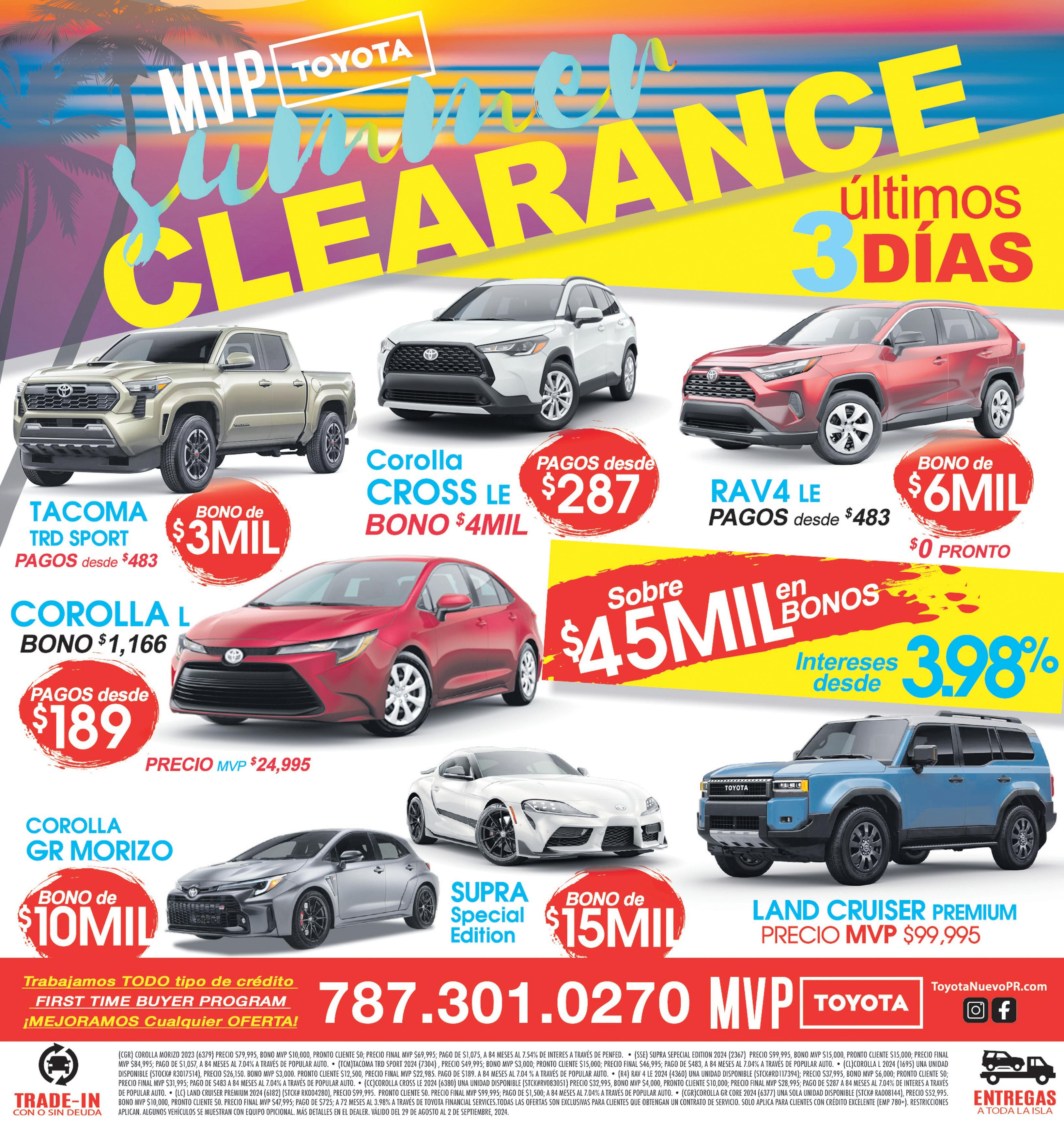 TFS. // 4. TACOMA 2024 - Bono válido para modelos 2024. // 5. CROWN 2023 interés aplica a modelos Crown código 4050 y 4051 a través de TFS para clientes perfil T1-plus, T-1 y T-2. // 6. $0 GASTOS DE TABLILLA, valorado en $312, aplica solo a modelos Tacoma 2023. // 7. ACCESORIOS originales GRATIS aplica solo a TACOMA [modelo 7304], estribos, racks y aros TRD. // 8. ACEITE Y FILTRO Gratis por vida, válido mientras cumpla con el plan de mantenimiento indicado por el fabricante y la unidad se mantenga registrada a nombre del comprador inicial. // 9 $0 pagos hasta Noviembre 2024 aplica a unidades designadas por la entidad bancaria. Más detalles en el dealer. // Todas las ofertas y términos no pueden ser combinadas. Para clientes con crédito excelente que sean aprobados. Las ofertas no incluyen gastos de registros, ACAA, seguros, ni tablillas. Precios y ofertas válidas hasta el AGO/30/2024. $0 $0 $0 TABLILLA GRATIS 6 ACCESORIOS ORIGINALES GRATIS 7 ACEITE + FILTRO GRATIS DE POR VIDA 8 RAV4 20242 Bajo Pago mensual $B 140 6 66 6 COROLLA LE 20243 Bajo Pago mensual $ 100050 5 APR 5 COROLLA CROSS 20241 Bajo Pago mensual $B 129957 5 7 $ 3,000 4 BONO