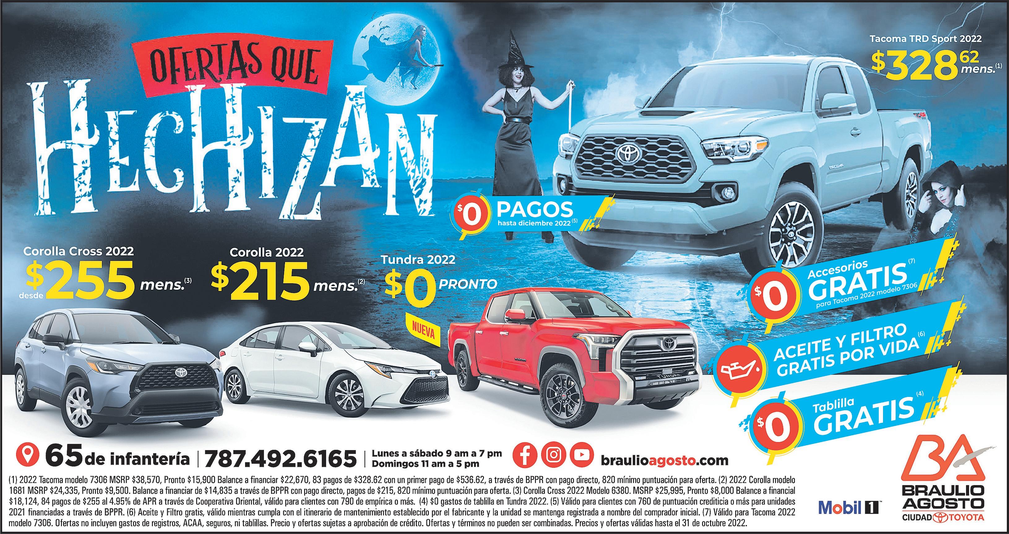 EL NUEVO DIA | S Á BA D O, 1 DE O CT U B R E DE 2022 36 !ÚLTIMOS 1. Garantía Por Vida aplica a todas las unidades nuevas. Ciertas restricciones aplican. Para más información favor de visitar el dealer. 2. Certied Pre-Loved Program exclusivo de Autocentro Más. Garantía de 7 años o 100,000 millas Power Train. Aplica a vehículos japoneses, de $15,100. Pago mensual de $99 al 5.70% APR a un término de 84 meses. Financiado a través de Toyota Financial Credit. 4. $0 pronto aplica a todas las unidades, sujeto a aprobación de crédito. 5. $0 pagos hasta febrero 2023. Sujeto a aprobación de crédito. 6. Bono 1 año, basado en consumo estimado según la EPA. Sujeto a aprobación de crédito. Ninguna oferta puede ser combinada con otra. Ciertas restricciones aplican. Ofertas válidas hasta el 3 de octubre de 2022 o mientras duren las unidades. Haz tu cita y te recibimos con los más altos estándares de seguridad contra el Coronavirus. 2022 TACOMA2022 VERSA2022 ROGUE 2022 COROLLA 0$PAGOS DESDE 3 99$ PRONTO40$ GARANTíA DE POR VIDAGARANTíA DE POR VIDA Autocentro Puerto Rico Con más de 1,000 unidades en liquidación