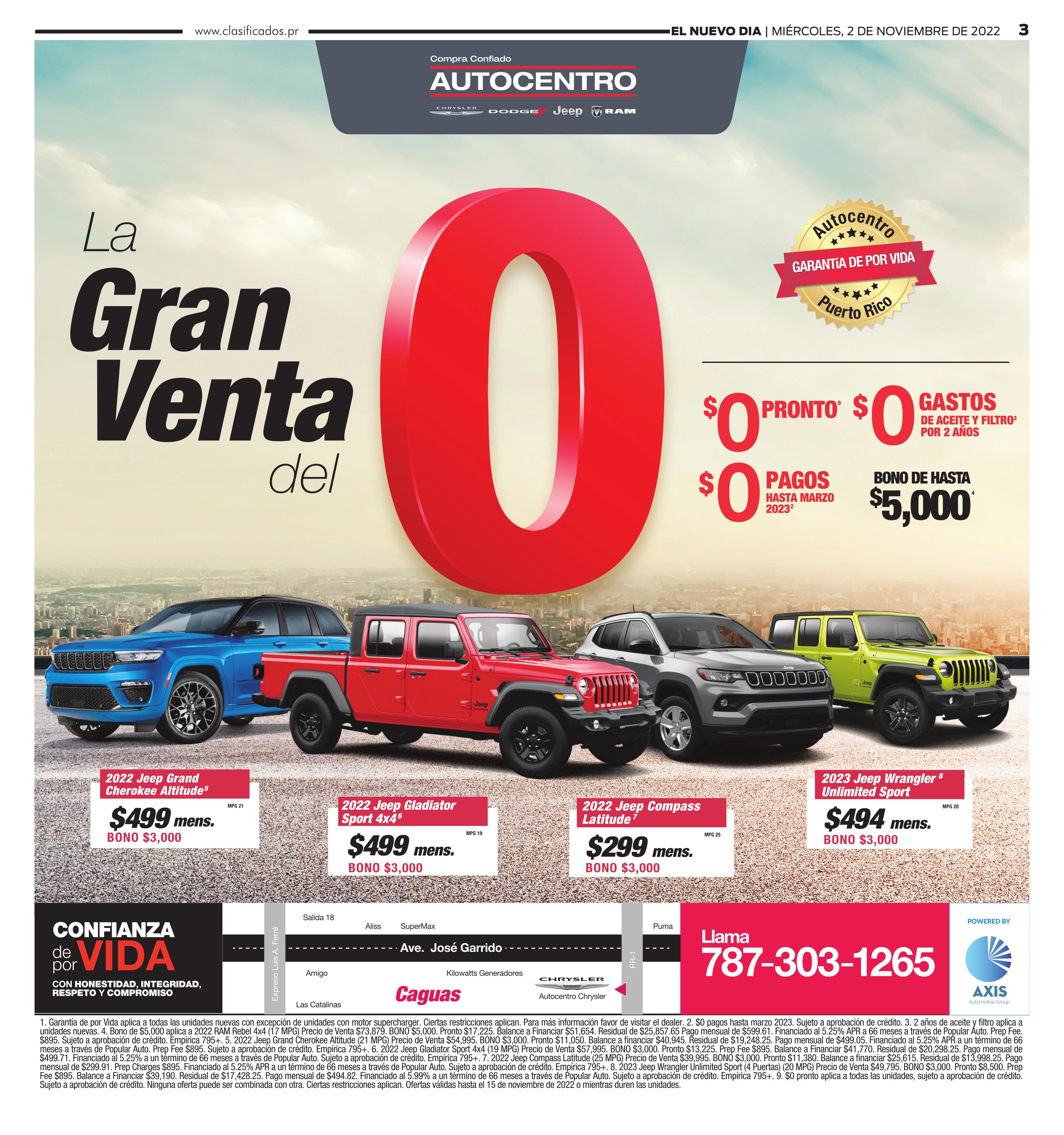 ificados.pr EL NUEVO DIA | MIÉRCOLES, 2 DE NOVIEMBRE DE 2022 5 GARANTíA DE POR VIDAGARANTíA DE POR VIDA Autocentro Puerto Rico 2022 HIGHLANDER14 $399 mens. $3,500 DE BONO 24 MPG 2022 COROLLA12 $103 mens. 33 MPG $2,200 DE BONO Autocentro Nissan Llama787-303-1265Antigua Lotería Jardín Botánico Toyota de Puerto Rico Pollo Tropical Walgreens Autocentro Toyota Río Piedras Hacia Río Piedras Hacia Caguas Avenida Muñoz Rivera Avenida 65 de Infantería Avenida Piñero $15,100. Pago mensual de $99 al 5.70% APR a un término de 84 meses. Financiado a través de Toyota Financial Credit. 3. $0 pronto aplica a todas las unidades, sujeto a aprobación de crédito. 4. $0 pagos hasta marzo 2023. Sujeto a aprobación de crédito. 5. vida aplica a todas las 2022 Toyota Tacoma nuevas. Aceite y ltro por 3 años aplica