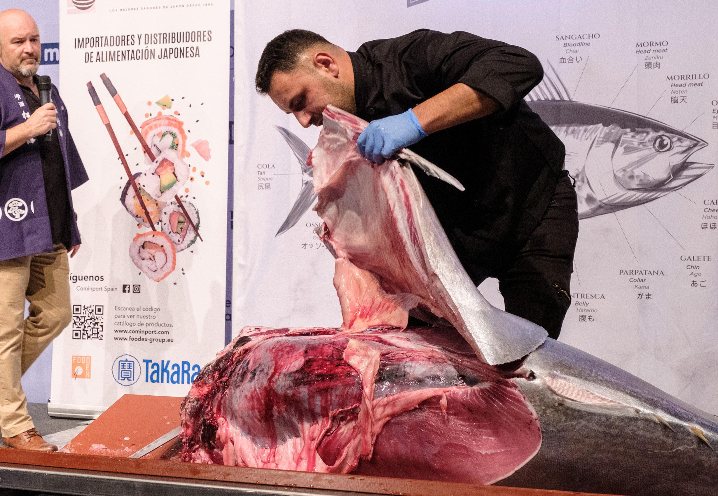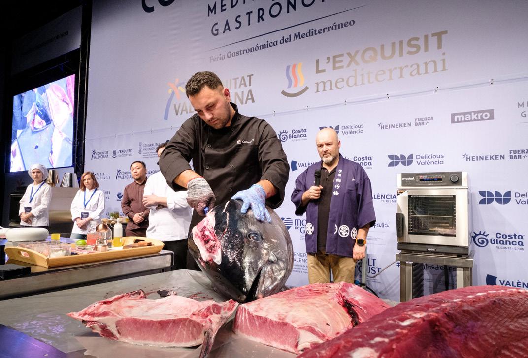 Además, la Cocina Central – L’Exquisit Mediterrani fue escenario del espectacular ronqueo del atún rojo. Grandes profesionales de Cominport hicieron una demostración única de despiece de corte y fisonomía del atún de la mano de Cristian Taché y, como punto culminante, el público pudo disfrutar de la ponencia «Japón y el Mediterráneo unidos por el atún rojo» con la participación de José Manuel Pérez, del restaurante Peix i Brases, Dénia (1*- 2 Soles), que puso ejemplos prácticos del papel del atún en la cocina mediterránea. Por su parte Masayuki Narumi, de Daikichi, Alicante dió el toque japonés al cocinado de este gran pescado.