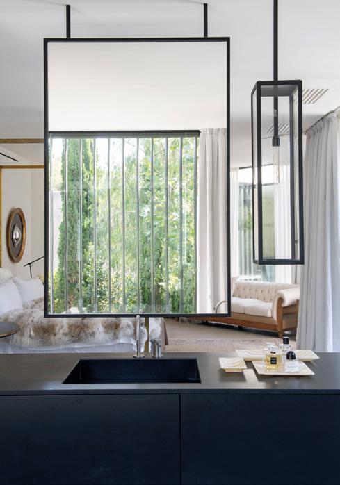 Both the bathroom and the central cabinet are custom designed in black Zimbabwe marble with a marble inlaid sink. Suspended mirrors with black iron profile and suspended lamps in theTEKNA model.