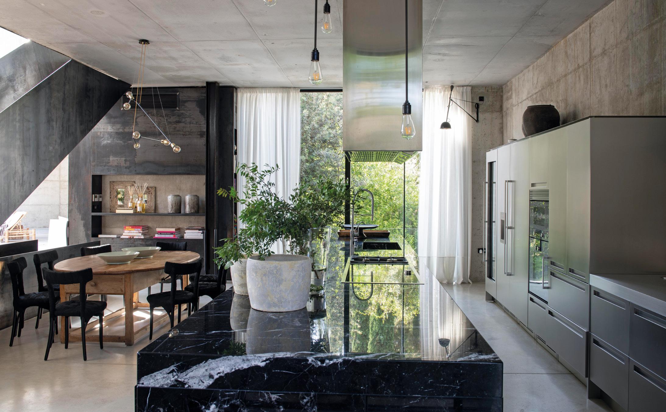 The main floor is a single open space, with large windows that overlook the garden and the pool. Living room with iron fireplace. Open kitchen separated from the living room by the iron volume of the staircase. A large black marble island stands out.