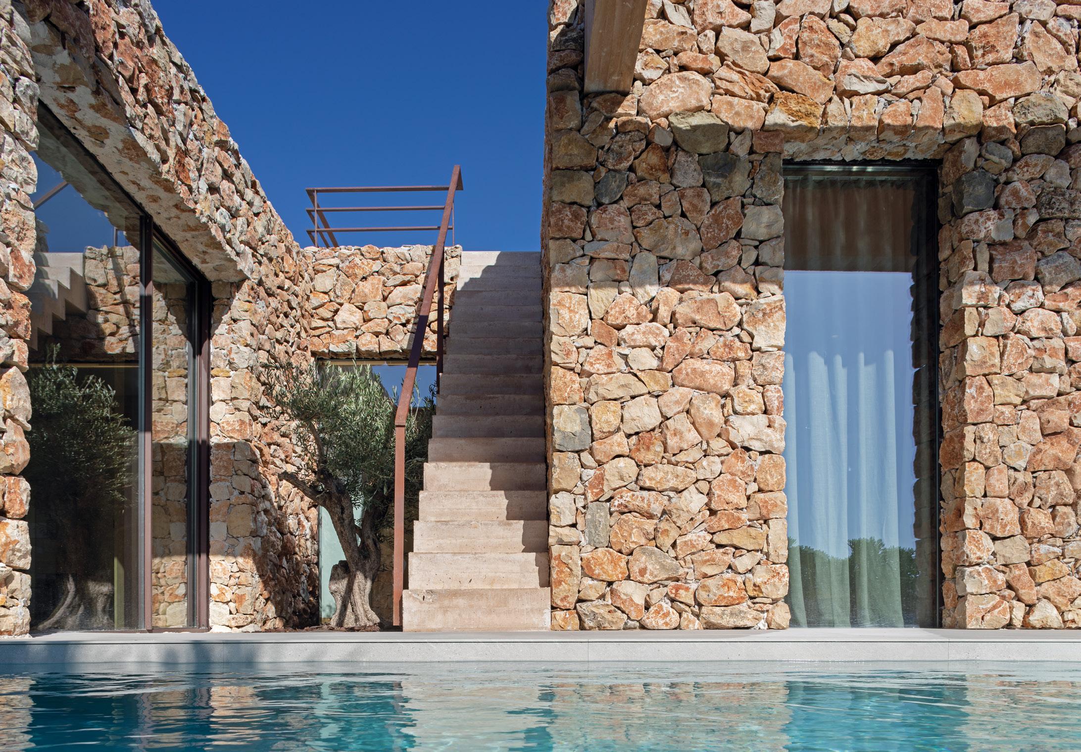 A series of stone volumes that leave semi-public spaces between them, connected by a pigmented exposed concrete structure, are accompanied by a sheet of water, which unites the entire complex.The largest volume, both in dimension and in height, is the day area and the rest is the night area.