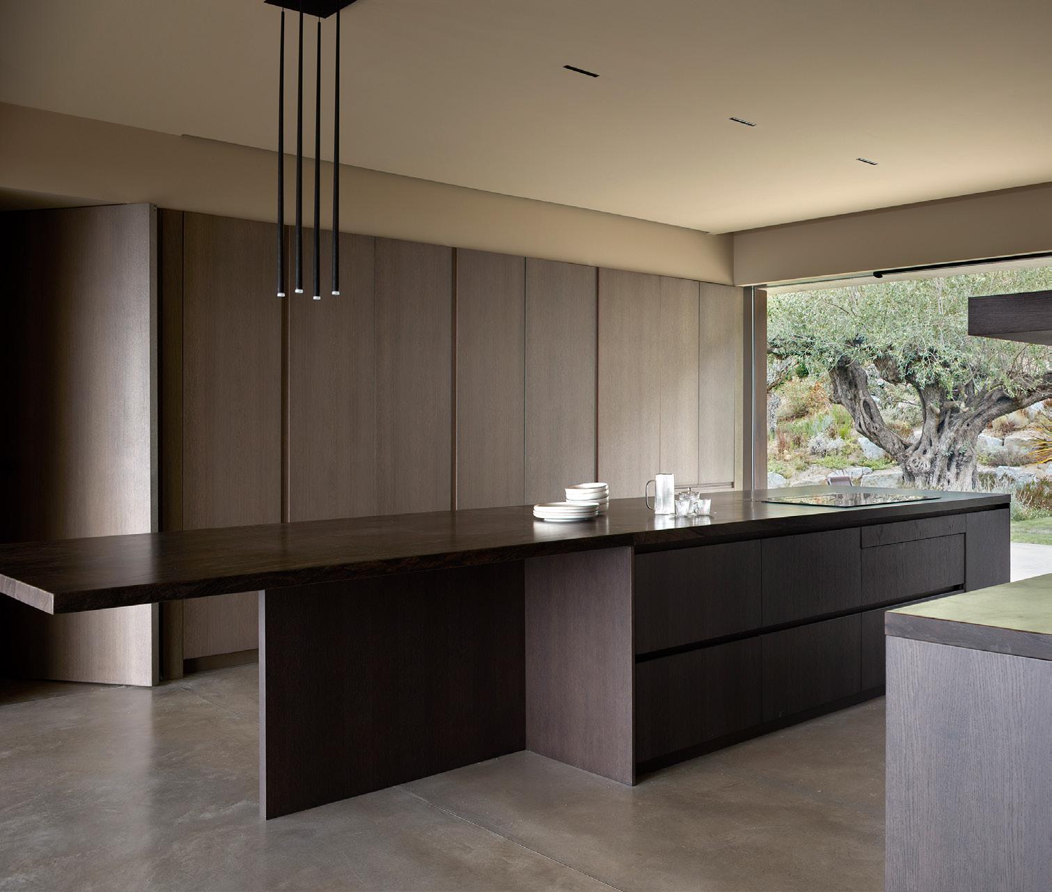 El movimiento de los volúmenes viene definido por la ubicación de los árboles singulares existentes, que se mantienen y envuelven la casa. El solar cuenta con una roca que emerge del terreno y ofrece una posición privilegiada, desde este punto se obtienen las mejores vistas al horizonte. En torno a esta roca se organiza la vivienda: la piscina adquiere un lugar protagonista donde el peñasco emerge del agua y la tonalidad azul marino se funde con el mar.