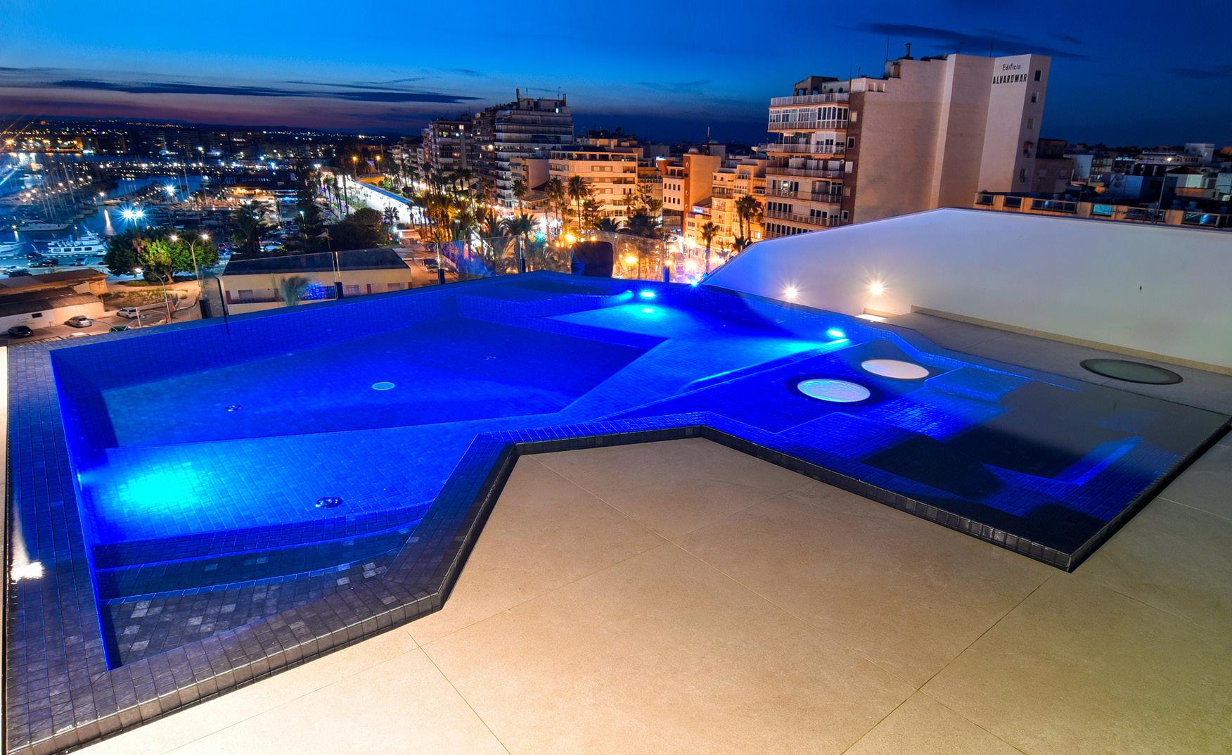 Para la medalla ORO en categoría de noche, destacamos la ubicación y diseño de la piscina, con unas vistas impresionantes al mar y la iluminación de colores que destaca sobre las vistas. La piscina infinity cuenta con cubierta automática y un color de gresite oscuro que en la noche acompaña al mar.