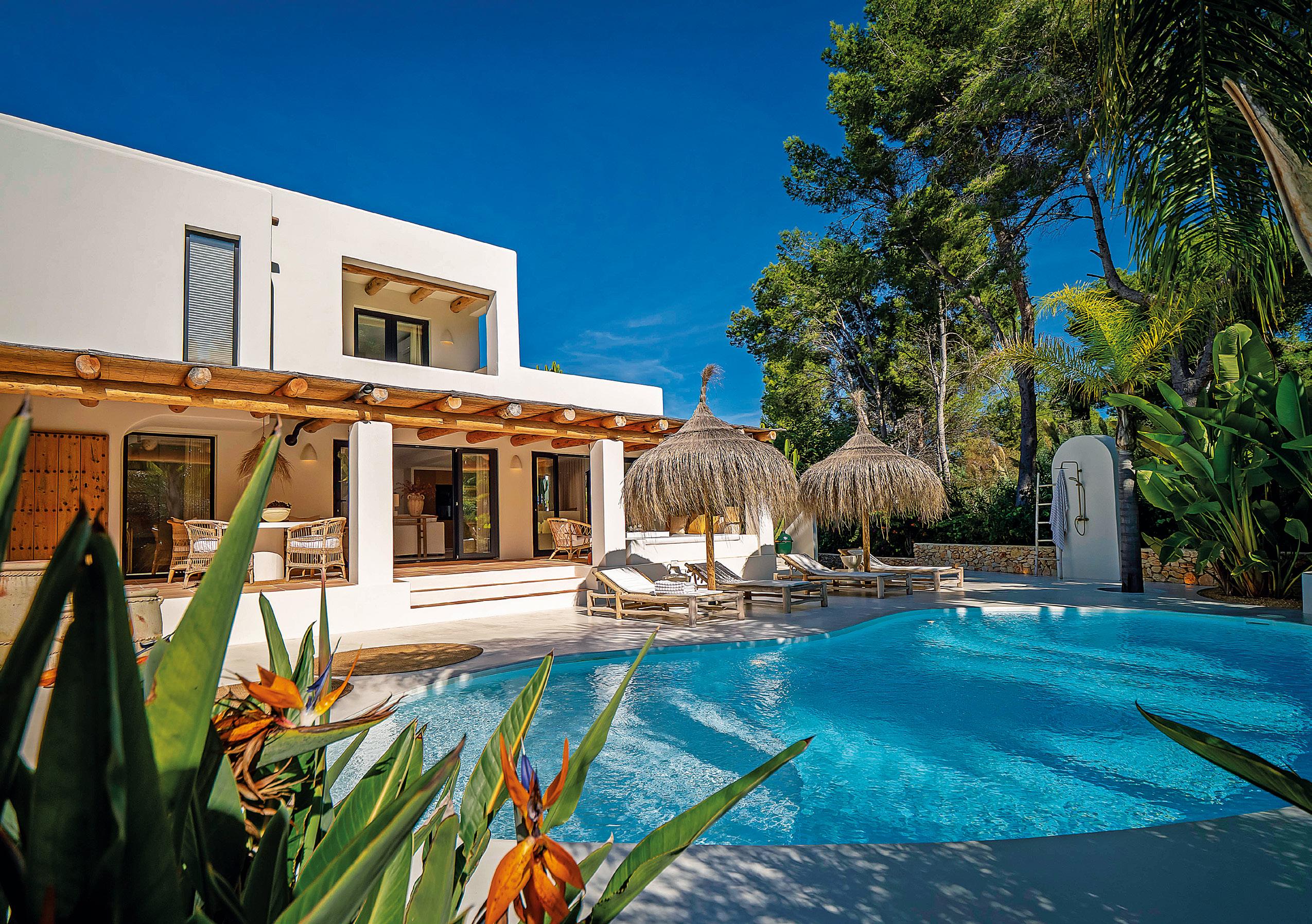 La piscina de diseño orgánico, con entrada tipo playa y aguas turquesas, es el eje del jardín tropical, rodeado de palmeras, strelitzias, zonas de descanso, barbacoa y comedor de verano.