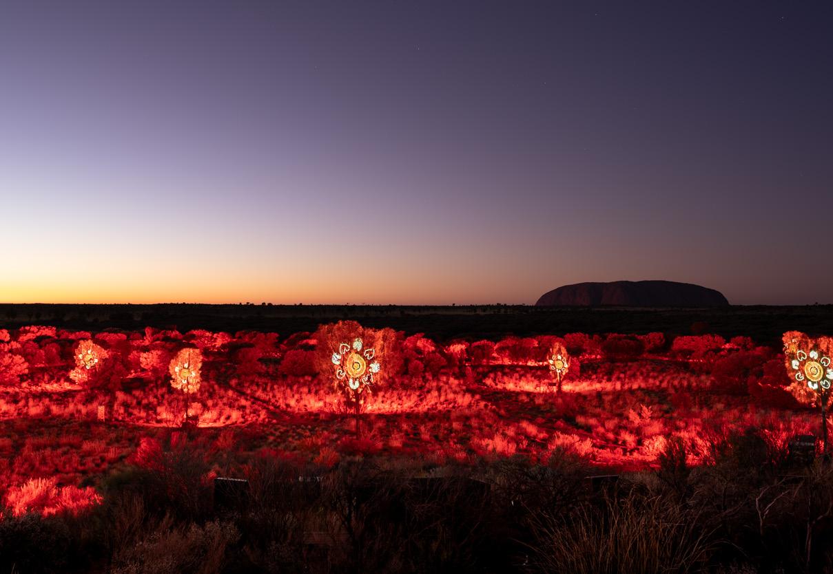 Sunrise Journeys is a newer offering that celebrates Indigenous art and storytelling at first light. Inspired by the collaborative artwork Ngura Nganampa Wiru Mulapa (“Our Country is Truly Beautiful”), this immersive experience projects the painting across the desert landscape as the sun rises over Uluru. Guests are treated to a nourishing breakfast infused with native ingredients and signature chai tea, while stories of love, land and connection unfold in a moving tribute to Anangu culture.