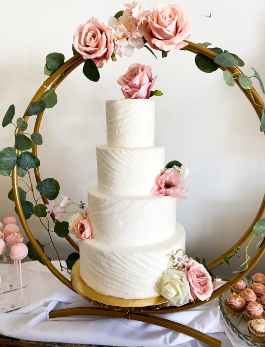Wedding cakes can be naked-iced, rustic, decorated like a tree stump, covered in flowers, designed like a slab of marble, have succulent details, have elaborate/glamorous scrollwork, or elegant stenciling, have a boho theme with pampas grass and dried botanicals, along with many more motifs. More and more cakes have tantalizing flavors like spice cake with browned butter frosting, cookies and cream cake with buttercream infused with sandwich cookies, strawberry lemonade, champagne, orange, key lime, Italian cream, or even something fun like confetti or rainbow colors inside.